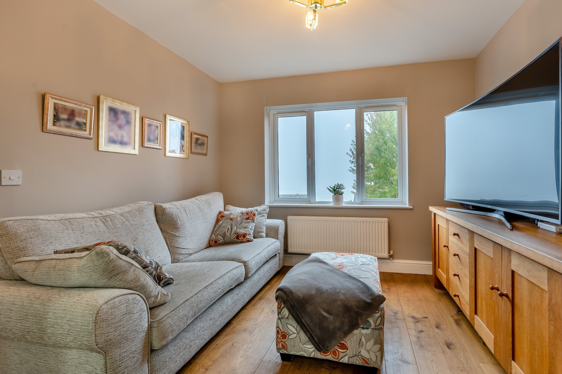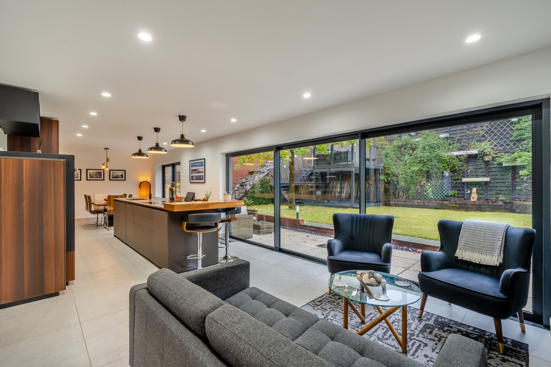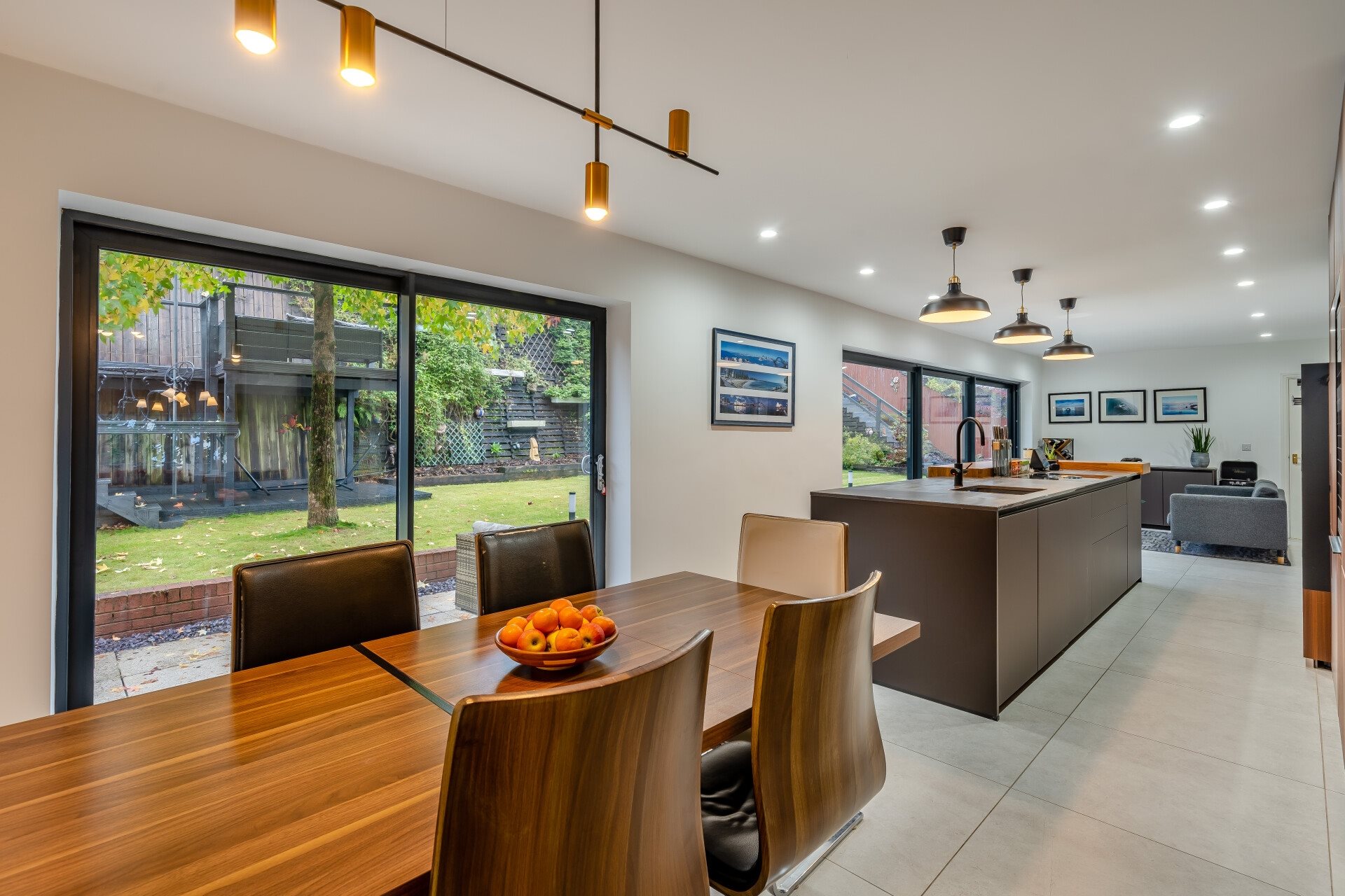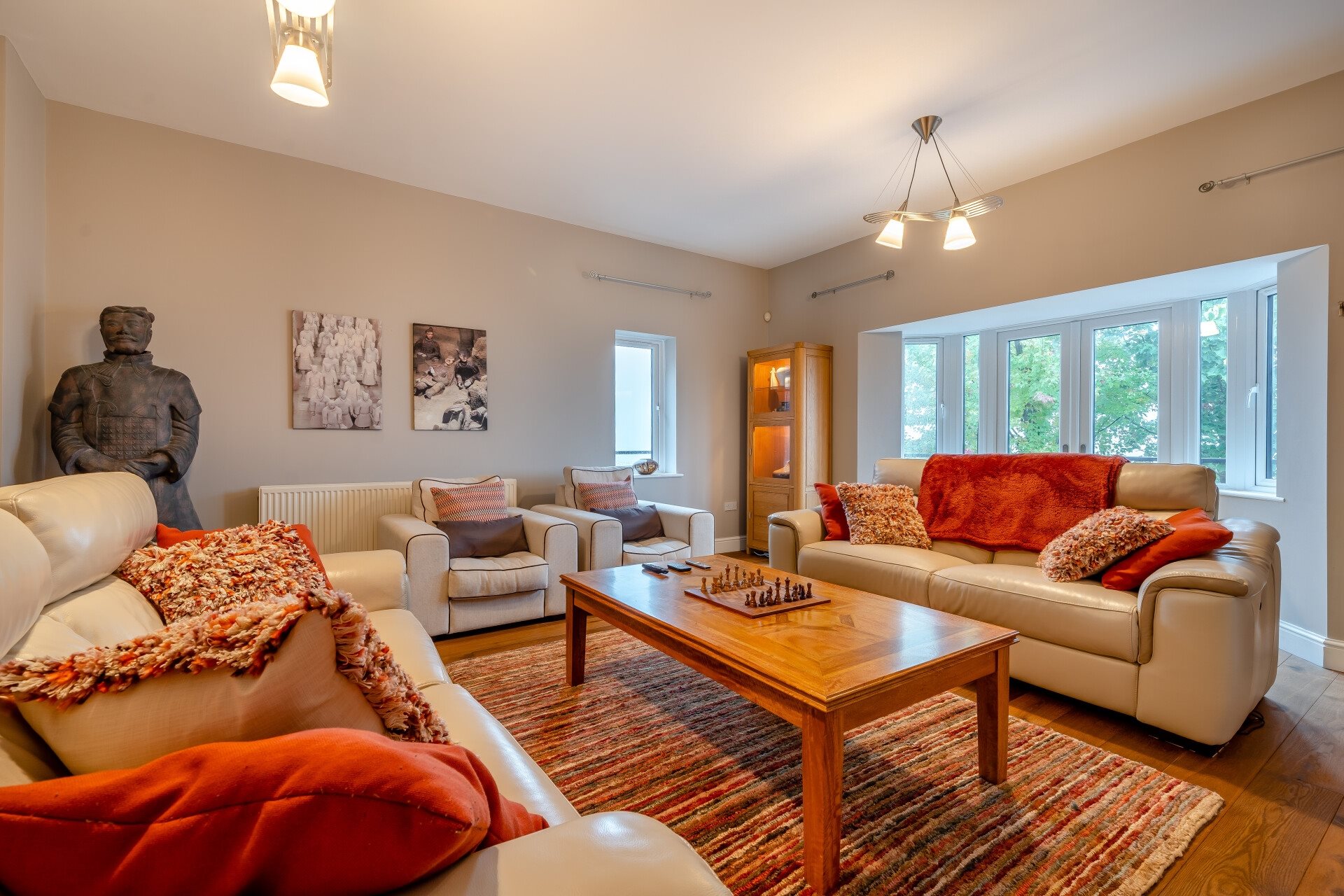 Adjacent to the sitting room is a modern, open-plan kitchen and dining area, boasting high-end fixtures and top-of-the-line appliances. Sliding doors lead out to the rear garden, creating a perfect blend of indoor and outdoor living. Off this space, a snug room offers a cosy retreat for quiet evenings, with views of the picturesque landscape.