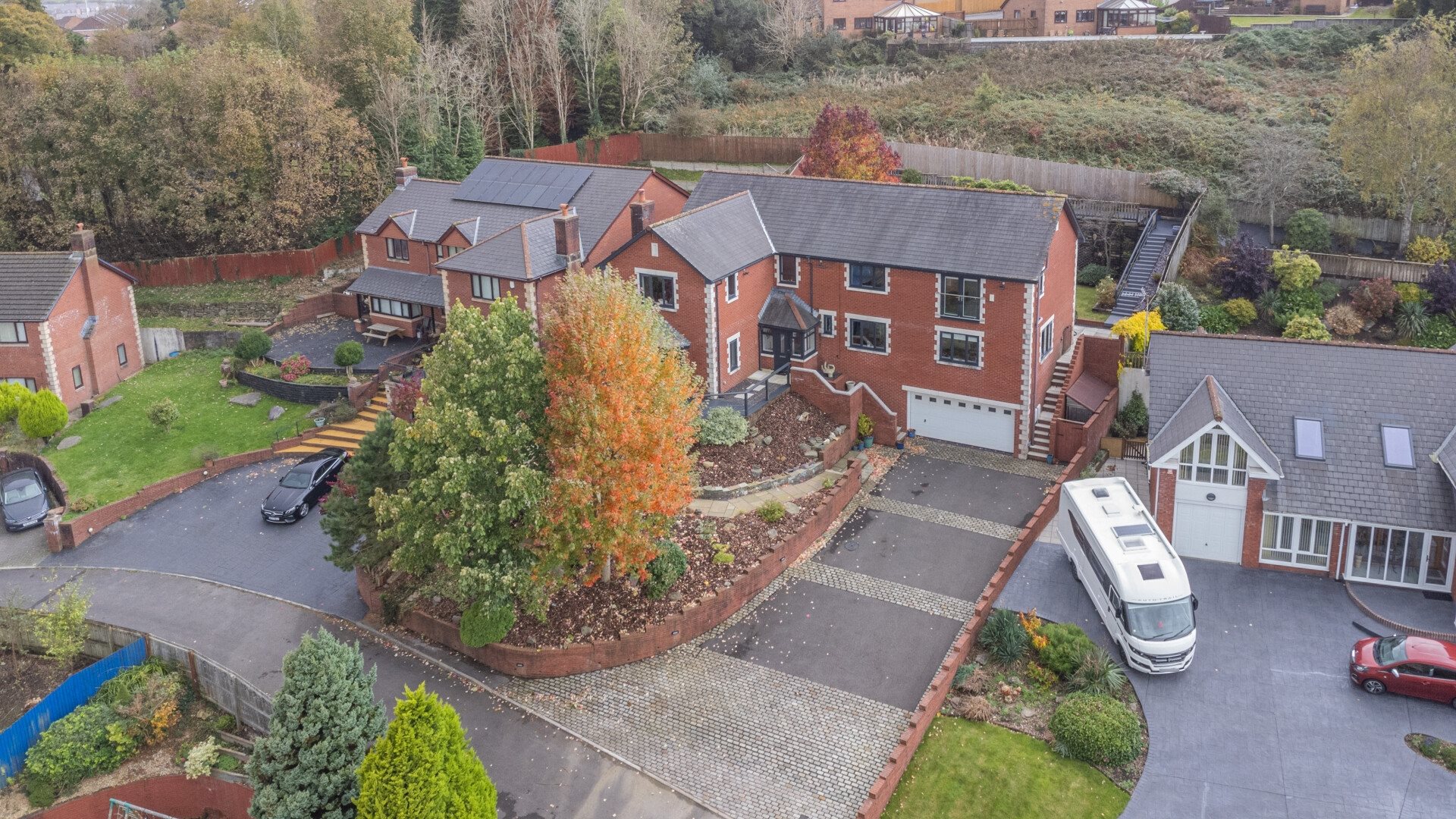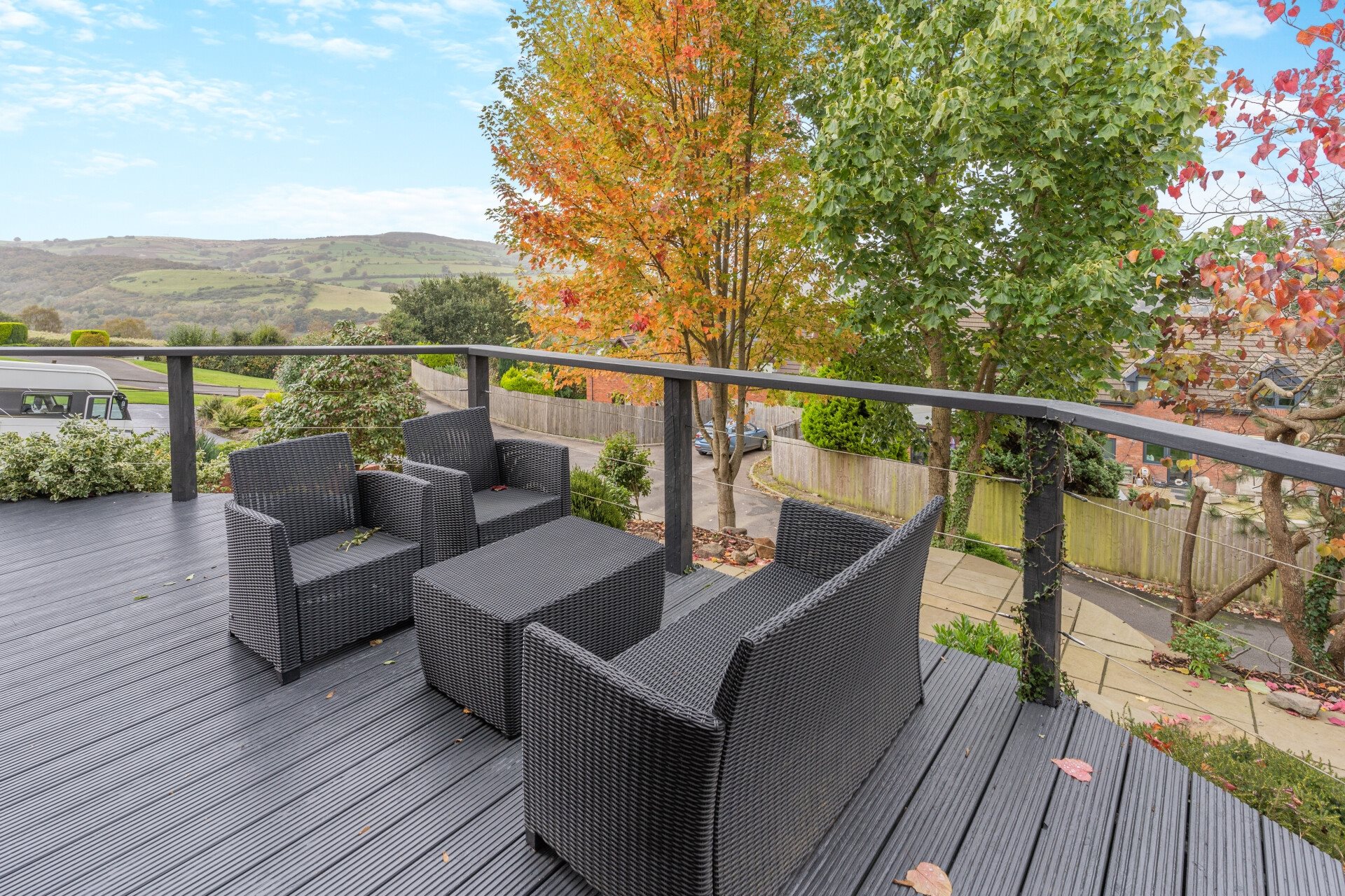 Outside - Outside, the property features a large driveway leading to an expansive garage with space for vehicles and storage. The tiered rear garden is an entertainer's dream, with multiple seating areas, a barbecue area, and a well-maintained lawn. The views over the area can be truly appreciated from the top of the elevated garden which provides a perfect area for lounging on a summer's day.