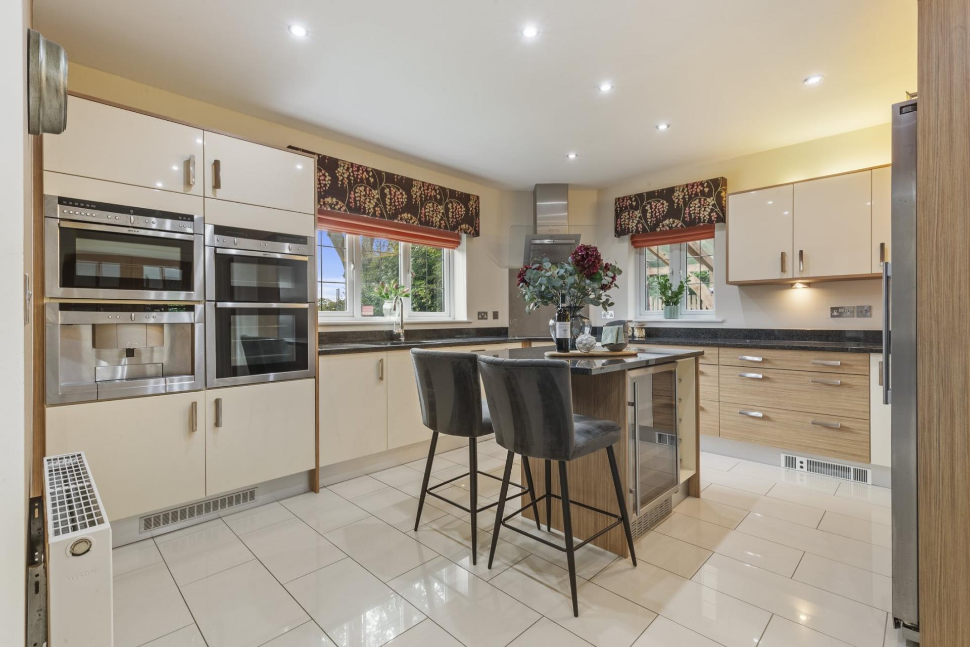 The heart of the home is the expansive open-plan kitchen and dining area, complete with a central island and bar stools, perfect for casual breakfasts or entertaining friends.
