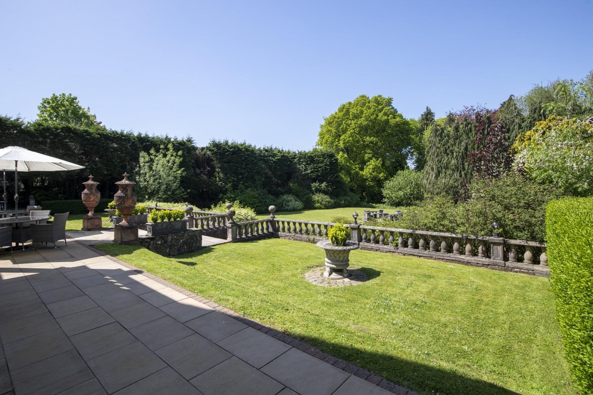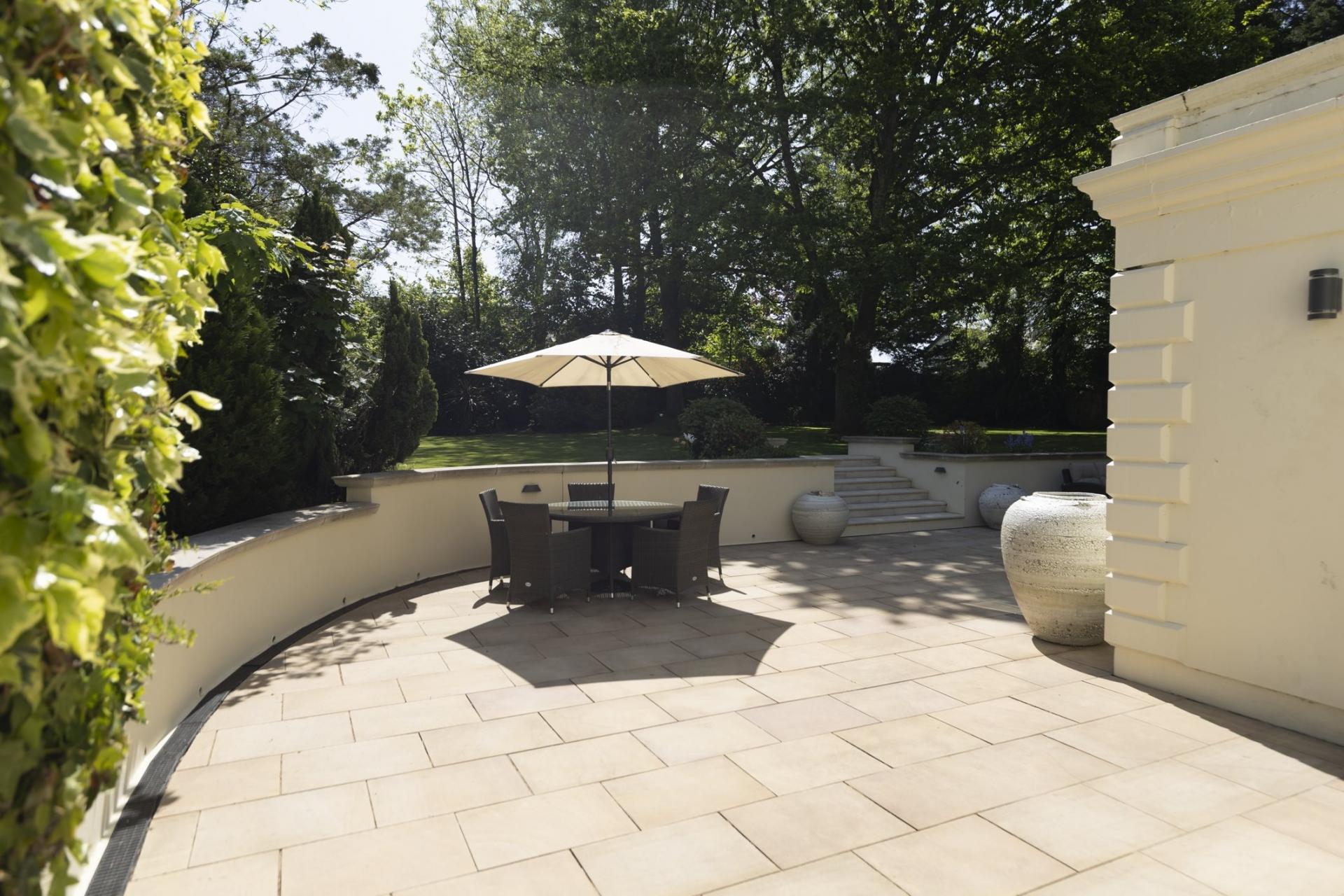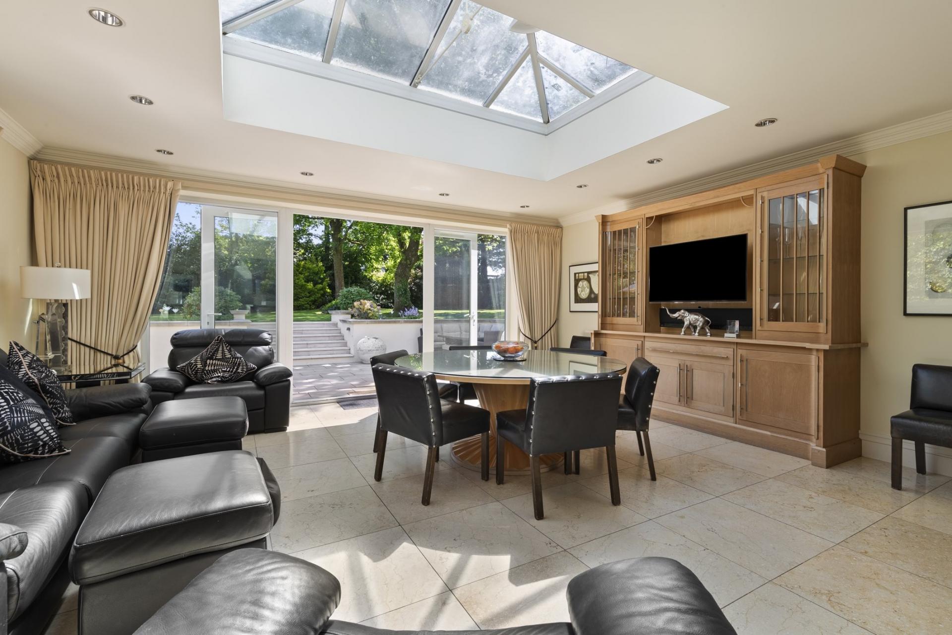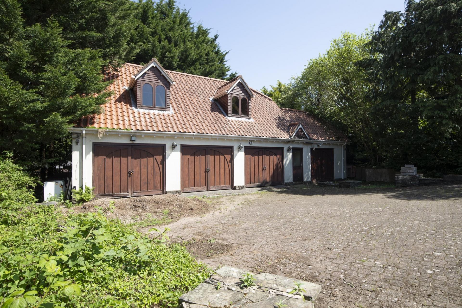 Outside - The grounds are divided into beautifully manicured zones for leisure and relaxation. From the kitchen and pool wing, a wraparound patio and large lawn stretch out to a private woodland area where planning has been approved for four detached homes. An outdoor sauna nestles in one garden corner, while another space reveals a BBQ terrace and a substantial, detached summer house that could serve as a self-contained residence for multigenerational living or Airbnb rental. There is also a large triple garage with additional accommodation above perfect for working from home, guest stays, or studio use.