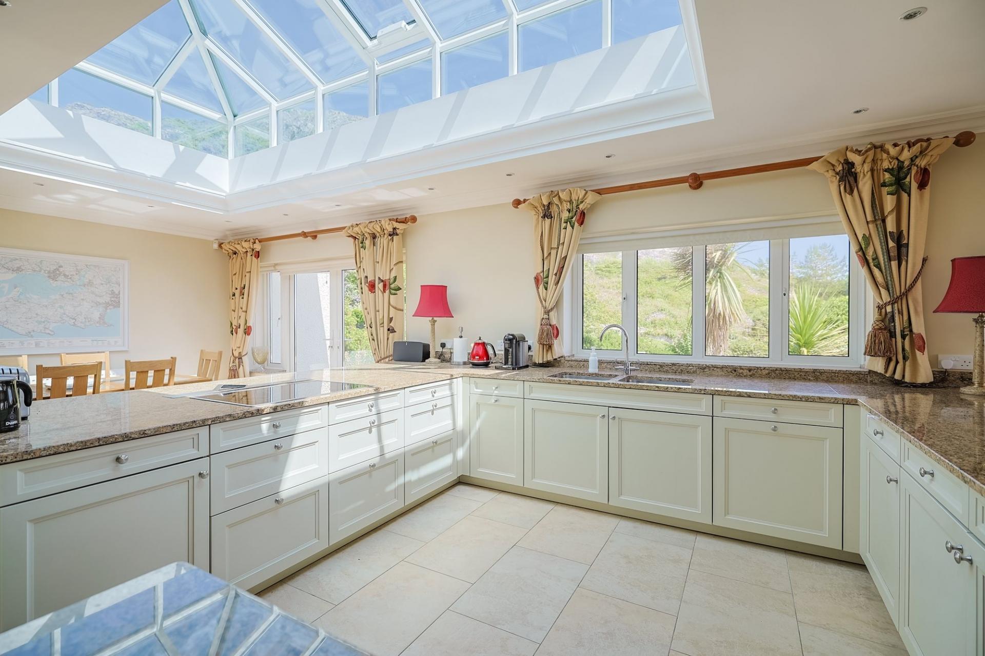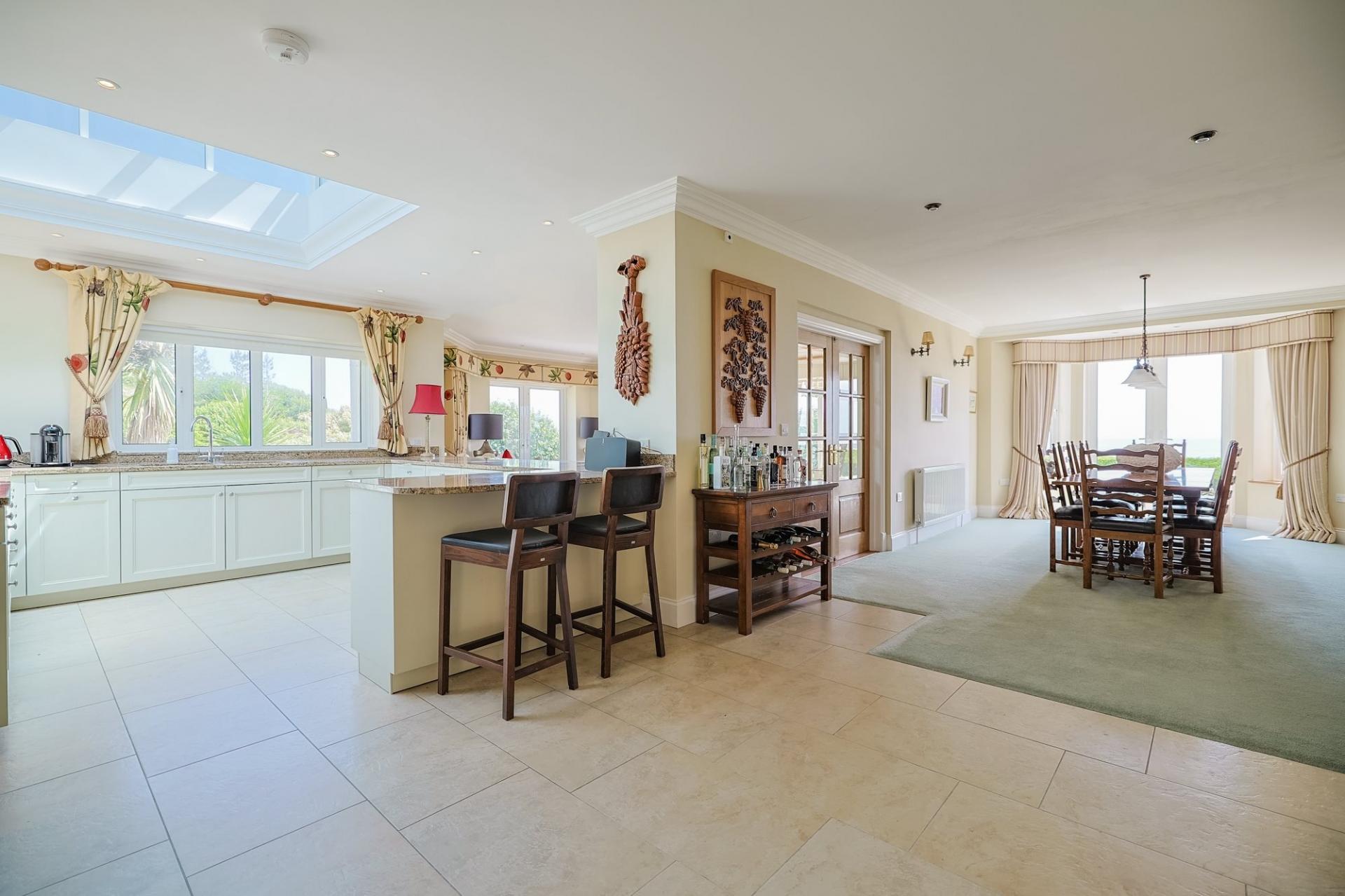 This spectacular open-plan space is a true heart of the home. An array of thoughtfully placed windows floods the area with natural light and showcases uninterrupted sea views. A stunning orangery-style window and four sets of double patio doors provide seamless indoor-outdoor living. The space is finished with a combination of tiled and carpeted flooring and enhanced by recessed spotlighting. The kitchen features a range of quality tall and base units with granite worktops and high-end integrated appliances, including two NEFF oven/grills, two NEFF warming drawers, a NEFF microwave, a 4-ring NEFF electric hob, Elica elevating extractor fan, a double Franke sunken sink with swan tap, NEFF dishwasher, a breakfast bar, and two tall fridge/freezers.