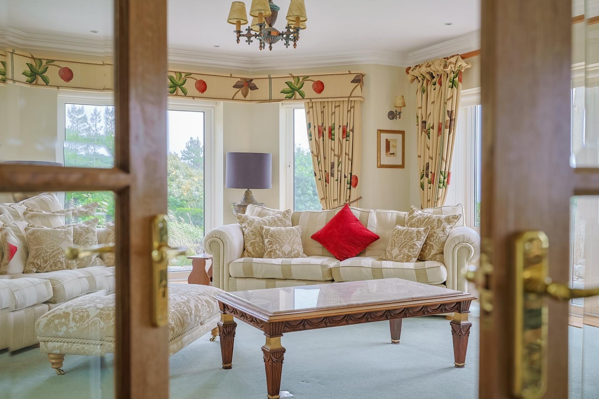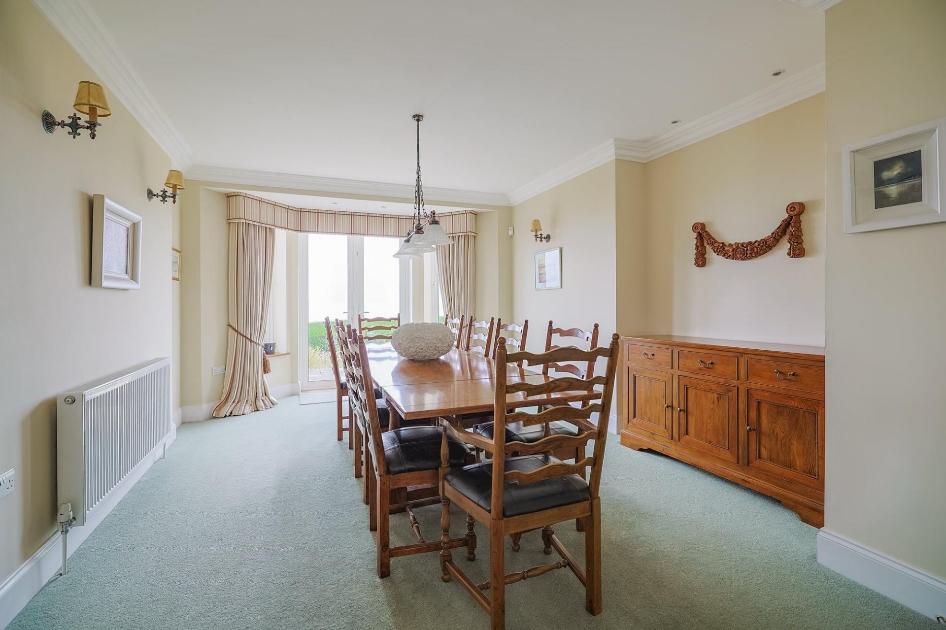 Situated to the front of the home and accessed via elegant double doors, the lounge is a tremendously bright and spacious room, bathed in natural light from triple-aspect windows. A set of double doors open onto a covered veranda, allowing you to enjoy the fresh sea air in all weather. This inviting lounge offers carpeted flooring, detailed coving, fitted shelving, and a feature gas fireplace a perfect spot to unwind.
