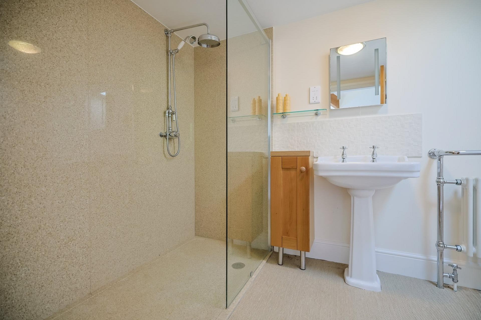Situated just off the kitchen is a convenient WC with tiled flooring, a WC, wash basin with bespoke hand-made vanity unit, spotlighting, heated towel rail, and extractor fan.