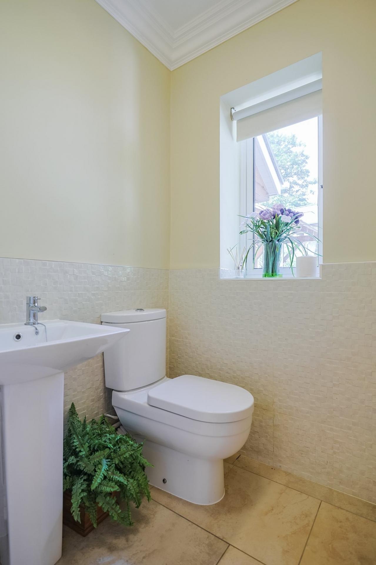 This further ground floor WC is fitted with a wash basin, WC, rear-facing window, extractor fan, tiled flooring, and partially tiled walls.