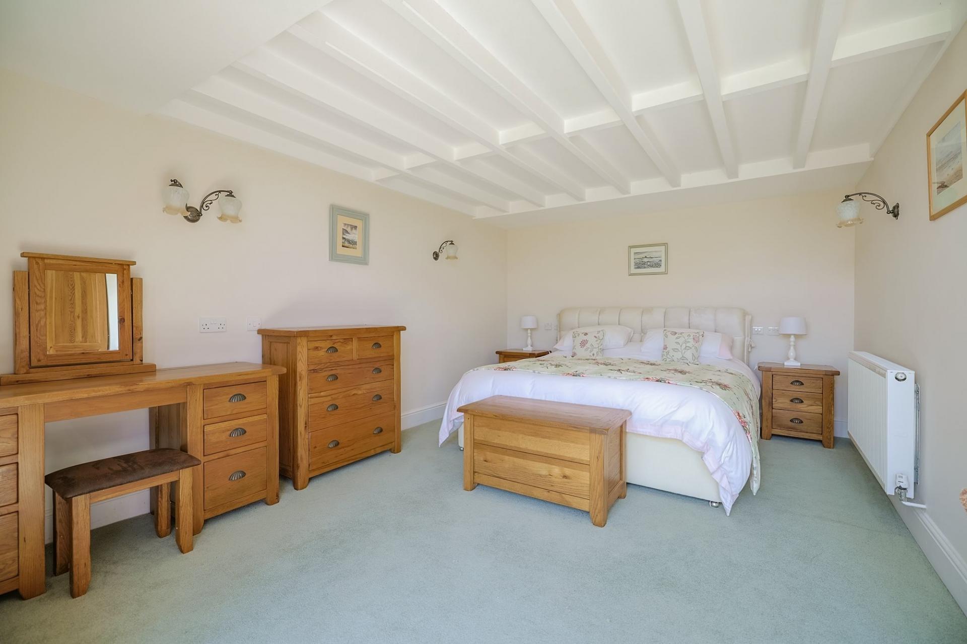 This stunning self-contained two-bedroom annex offers a fabulous open-plan lounge and kitchenette area. You are immediately drawn to the vaulted ceiling with exposed beams and the feature rear window, along with double patio doors framing the sea and garden views. Additional doors and feature windows enhance the space further. The lounge area boasts beautiful wood detailing and carpeted flooring. The kitchenette is equipped with a stainless steel sunken sink, base storage, and a wall unit. A ground floor bedroom is filled with natural light through an arched front-facing window with patio door. This spacious double bedroom has carpeted flooring, spotlights, and wall lighting. The stylish shower room includes a walk-in shower, WC, wash basin, extractor fan, heated towel rail, and two shaving points. Ascend the carpeted stairway to the upper floor where you'll find a further double bedroom with carpeted floor, a Velux window and eaves storage.