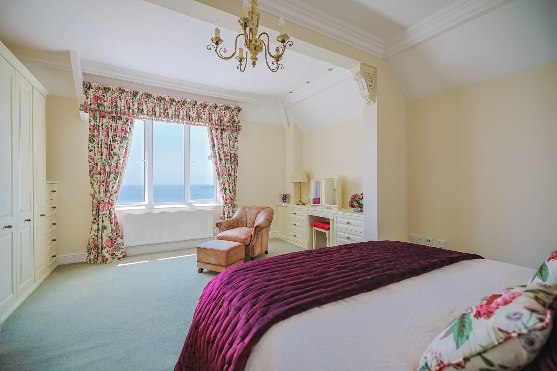 Located at the front of the home, bedroom two offers an exceptional view through a large picture window that overlooks the garden and sea. This beautifully bright double room features carpeted flooring, detailed coving, and bespoke, hand-made, fitted wardrobes, drawers, and a dressing table. There's also space for a seating area to enjoy the view. The ensuite is luxuriously appointed with a WC, wash basin with granite-topped bespoke hand-made units, a walk-in shower, heated towel rail, spotlights, extractor fan, and a Velux window.