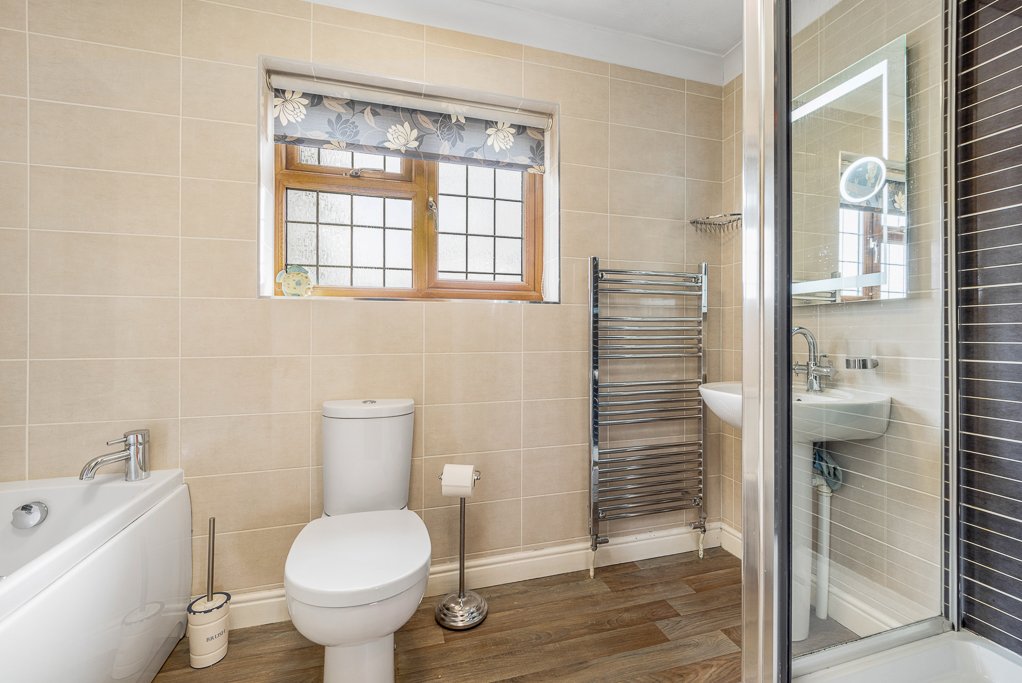 • Large, modern family bathroom, fully tiled, with bath and separate shower