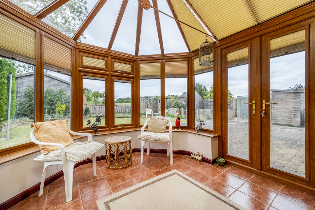 • Generous conservatory with fitted blinds, tiled floor and French-doors to the rear terrace