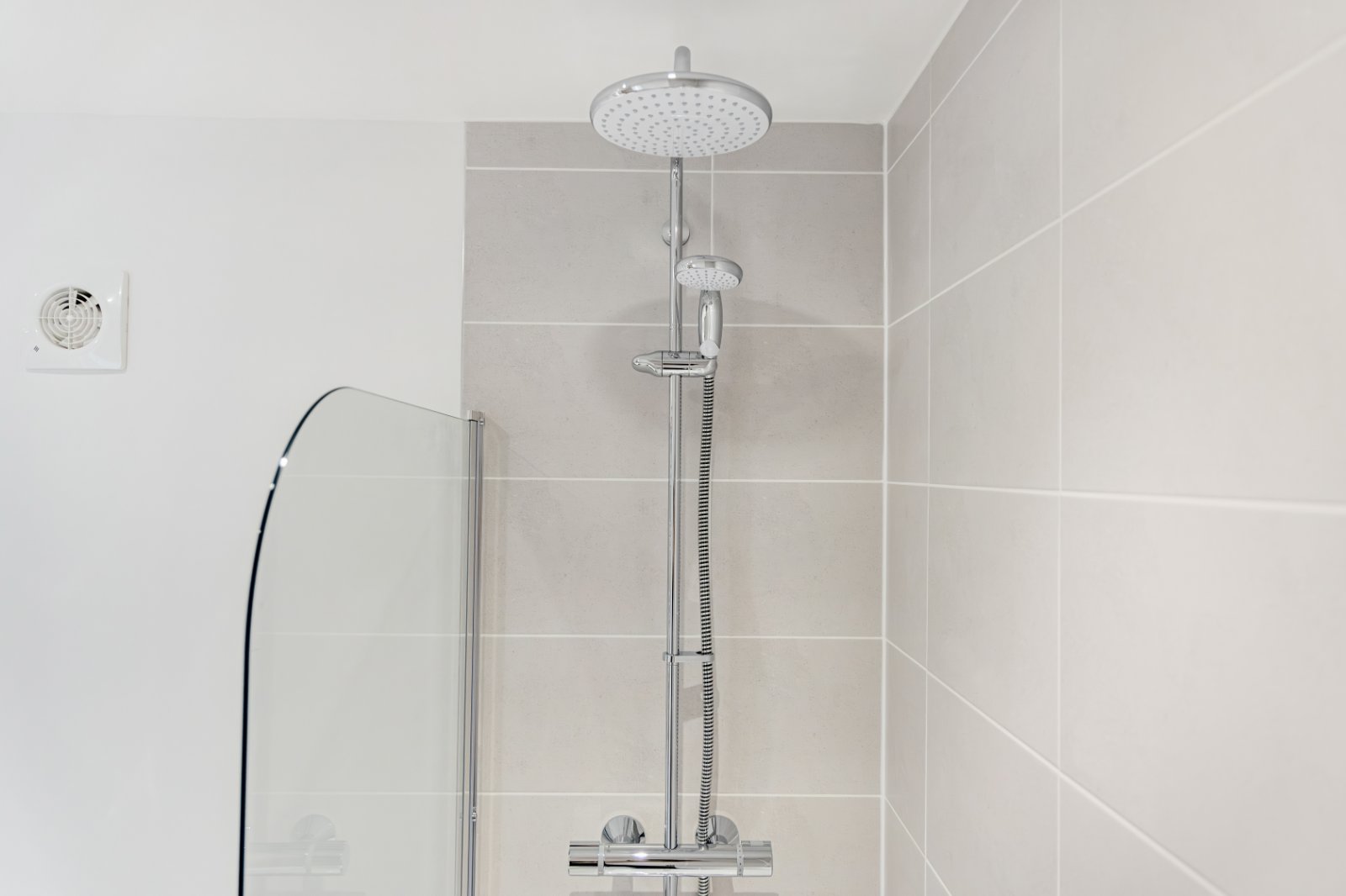 The Tallow interior has underfloor heating on the ground floor from an air source heat pump with a combination of luxury vinyl flooring and fitted carpet throughout. From the front entrance hall, doors open into a large - almost 16 foot long - living room into a bay at the front, a kitchen at the back and a downstairs WC. The spacious open plan kitchen dining room, with a concealed utility area within it, benefits French doors onto the garden at the back where a paved terrace offers plenty of space for alfresco dining. The classic, Shaker style fitted kitchen incorporates Bosch appliances with 2 single ovens, one eye-level, and an induction hob and extractor over. A Bosch dishwasher and fridge freezer are also integrated within the units.