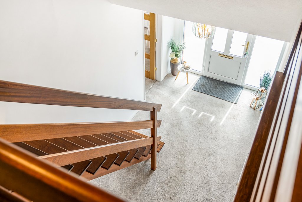 “The house has a spacious feel. It’s flooded with light thanks to the large windows – including a stunning bay window in the living room. The hallway is spacious too, with an open-plan staircase and a galleried wall that extends up to the first-floor landing area.”