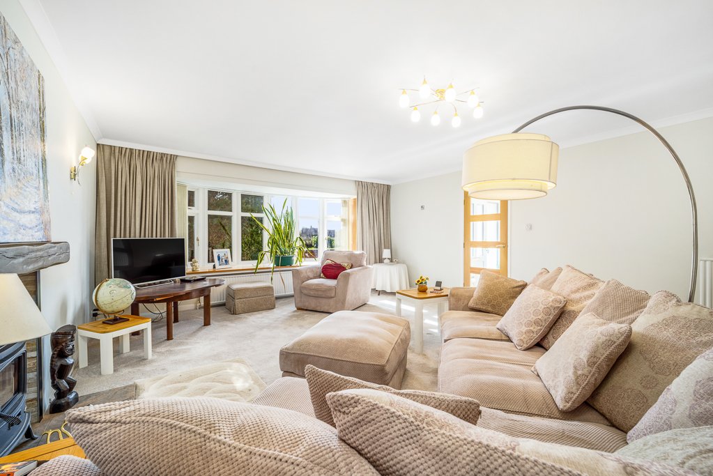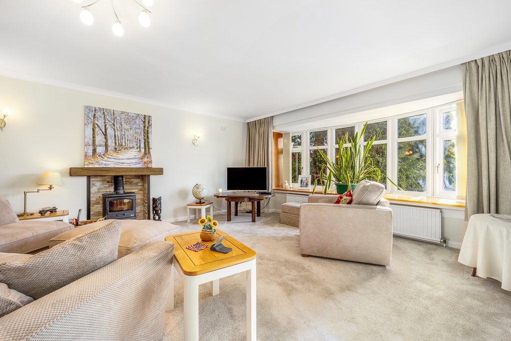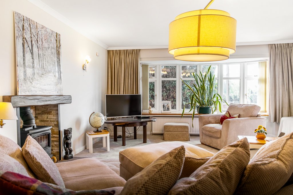 - 22ft living room with a large bay window, modern stone fireplace and mixed fuel log burner