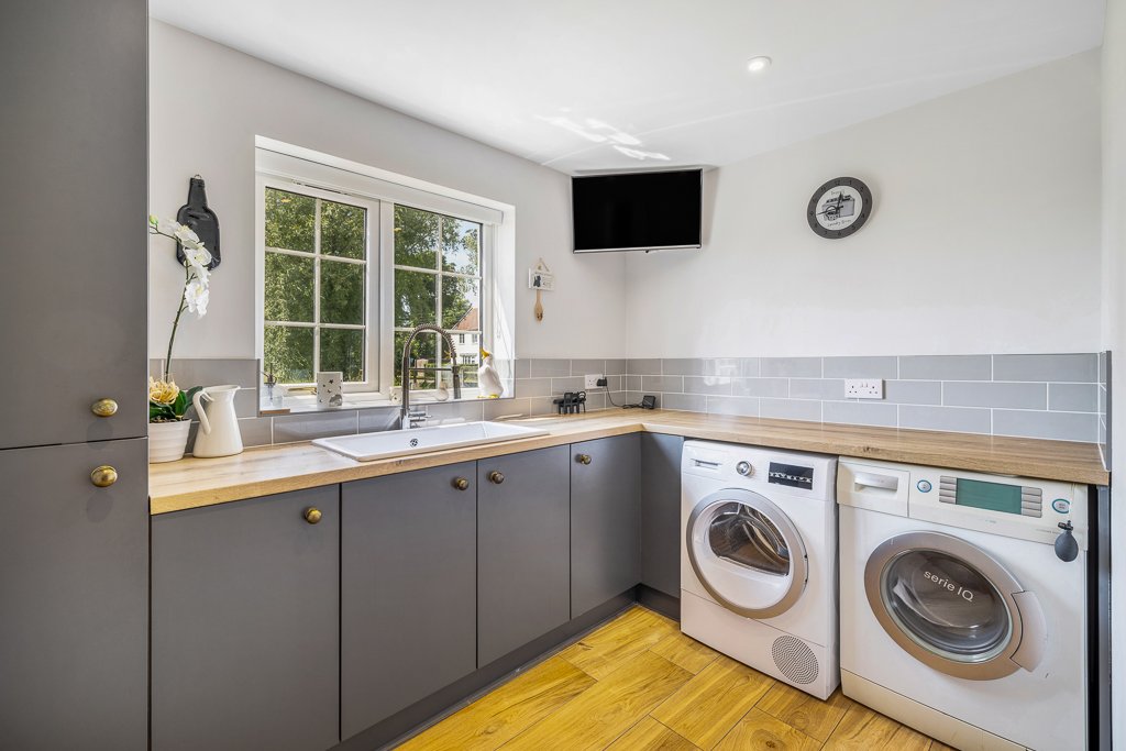 The light-filled ground floor accommodation showcases a stunning open-plan kitchen, breakfast and dining area with high specification units, worktops and appliances with bi-folding doors opening onto a secluded sun terrace. Additional living spaces include a 22 ft lounge with an inglenook fireplace, a separate snug, a ground-floor double bedroom with en-suite, a generous family bathroom, and a well-equipped utility with separate pantry. The first floor features four further bedrooms, including a luxurious principal suite with an en-suite shower room and dressing room, complemented by a stylish family bathroom.