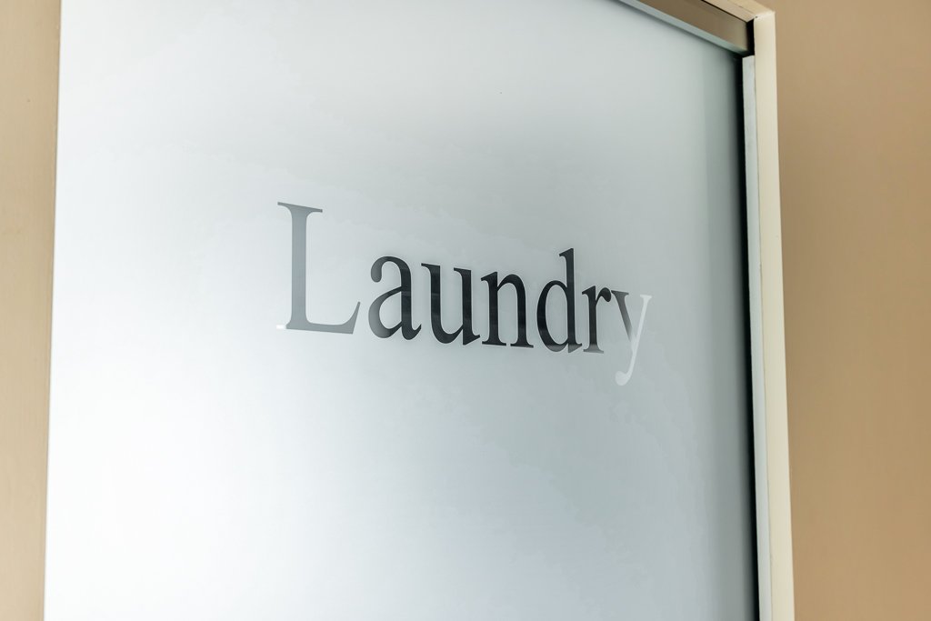 • Laundry with glass pocket-door access, space for washer and dryer and Butlers sink