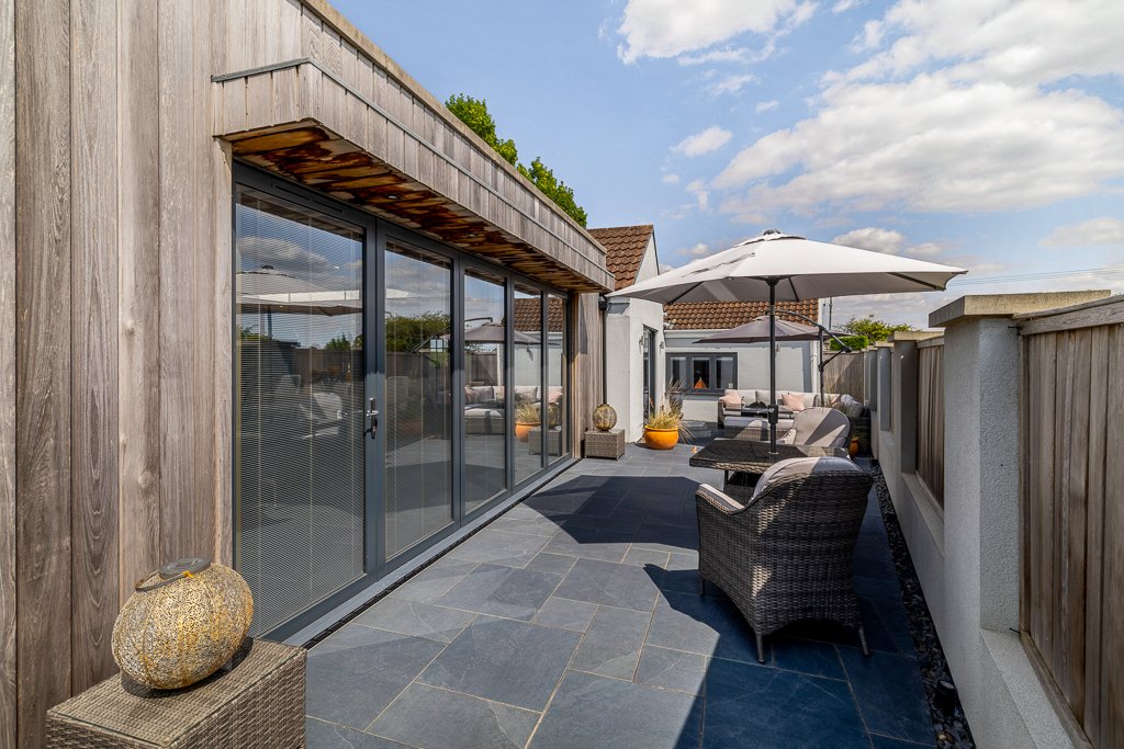 “We were fortunate to be able to purchase additional land, which allowed us to construct in 2019 the cedar-clad kitchen and dining extension. This space has truly become the heart of the home, perfect for everyday living, entertaining, and family gatherings. The kitchen is a chef’s dream, featuring carefully chosen details, including a Dekton worktop on the island—favoured by professionals for its durability and heat resistance. The bi-fold doors, which each open independently, leads onto the rear terrace, creating a lovely connection between the kitchen and garden, with the terrace enjoying the sun throughout the day.”