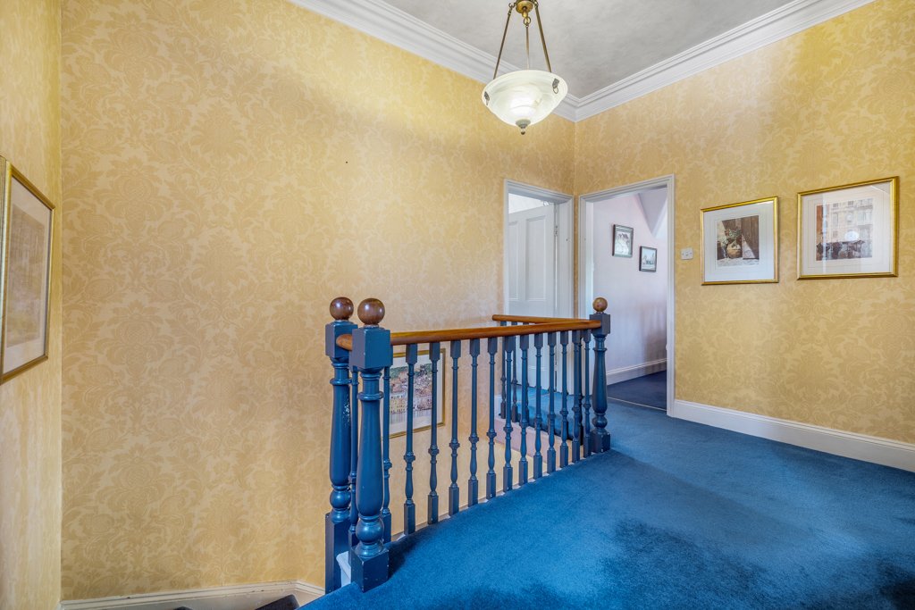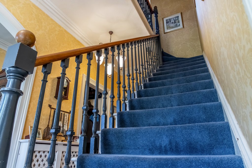 • Carpeted staircase with Victorian newel posts and spindles leads up to the first floor