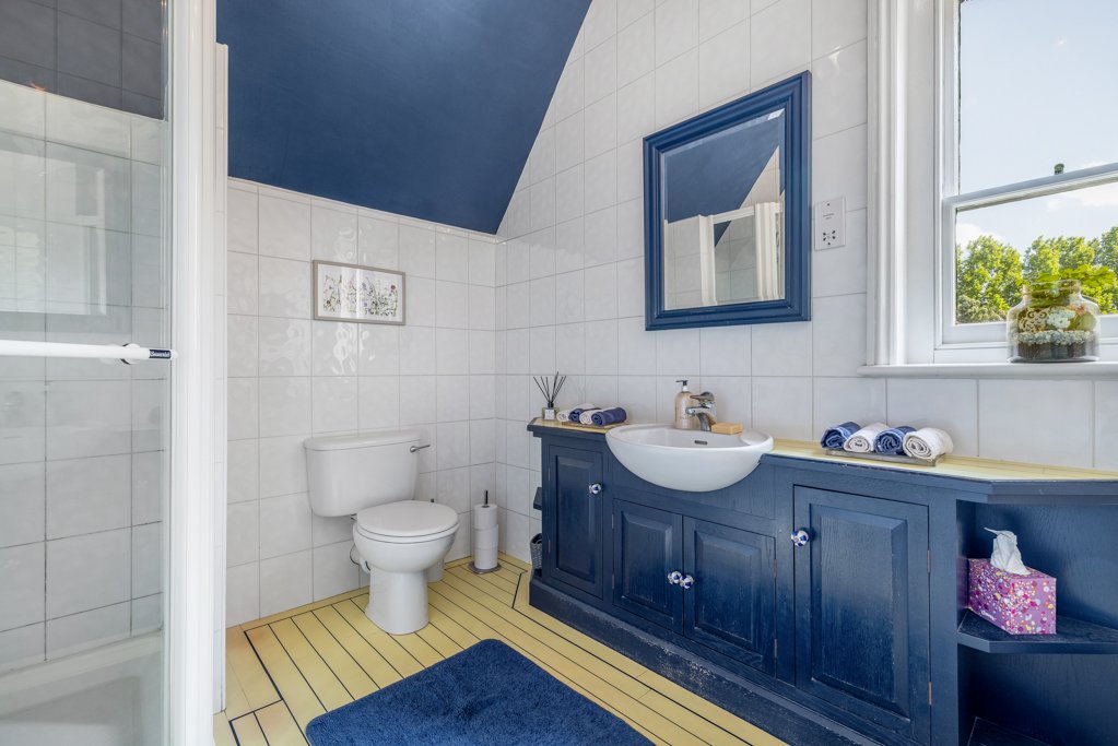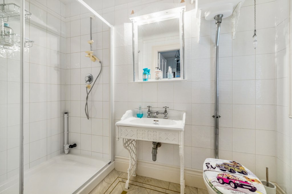 • Tiled ground floor shower room with Victorian style ceramic sink and high level cistern