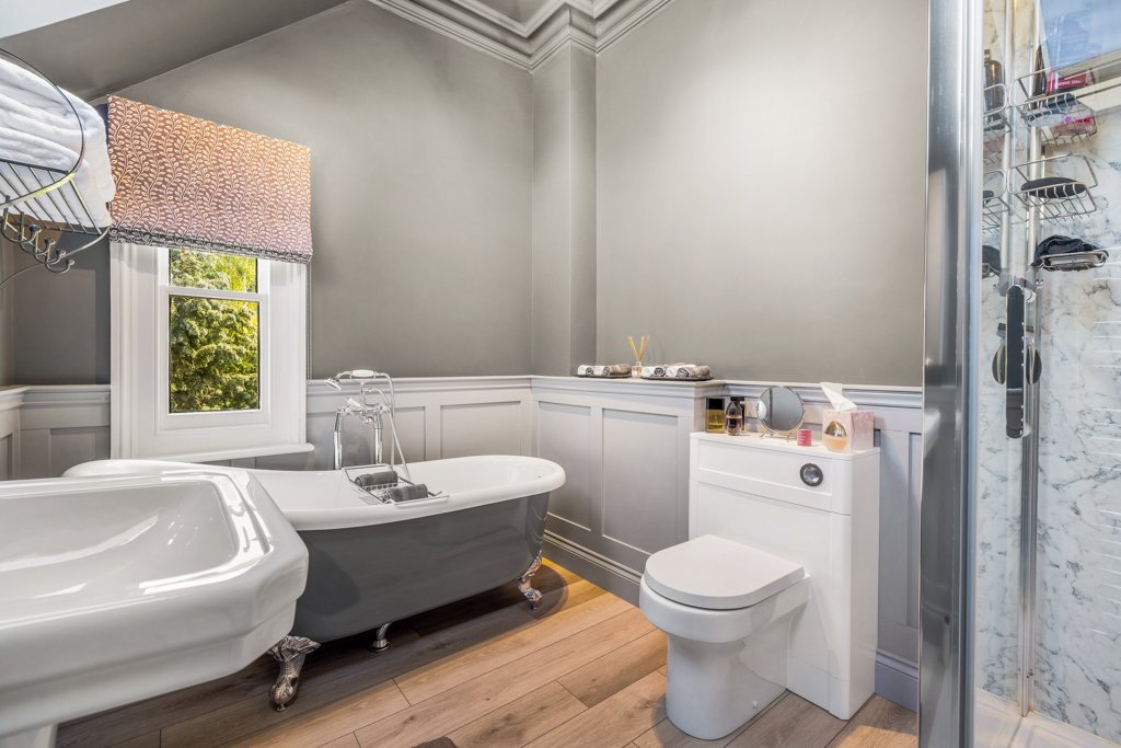 • Opulent half panelled en-suite bathroom with freestanding claw foot bath & separate shower