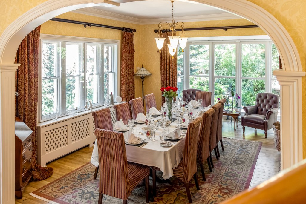 • Dining room with sash & huge projecting bay window overlooking the formal gardens