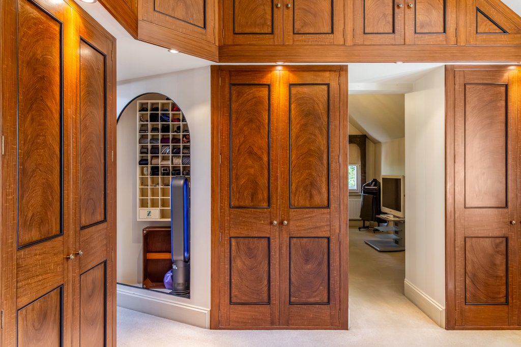 • Made to measure mahogany effect dressing room cupboards, arch with tie rack & fireplace