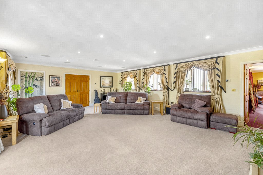 From the moment you arrive, the long, sweeping driveway creates a memorable first impression. Step inside, and the grand reception/dining hall – with its soaring windows, vaulted ceilings, and dramatic galleried landing – sets the tone for what lies beyond. At the heart of the home, an expansive open-plan kitchen leads into a magnificent orangery, while a games room, complete with a fitted bar, provides the perfect space for entertaining. Upstairs, six spacious bedrooms (including two with en-suites) provide ample accommodation for family and guests, complemented by a family bathroom. A detached oak barn serves as a versatile garage and workshop or leisure use .