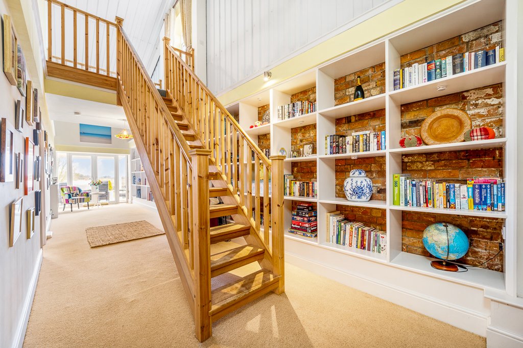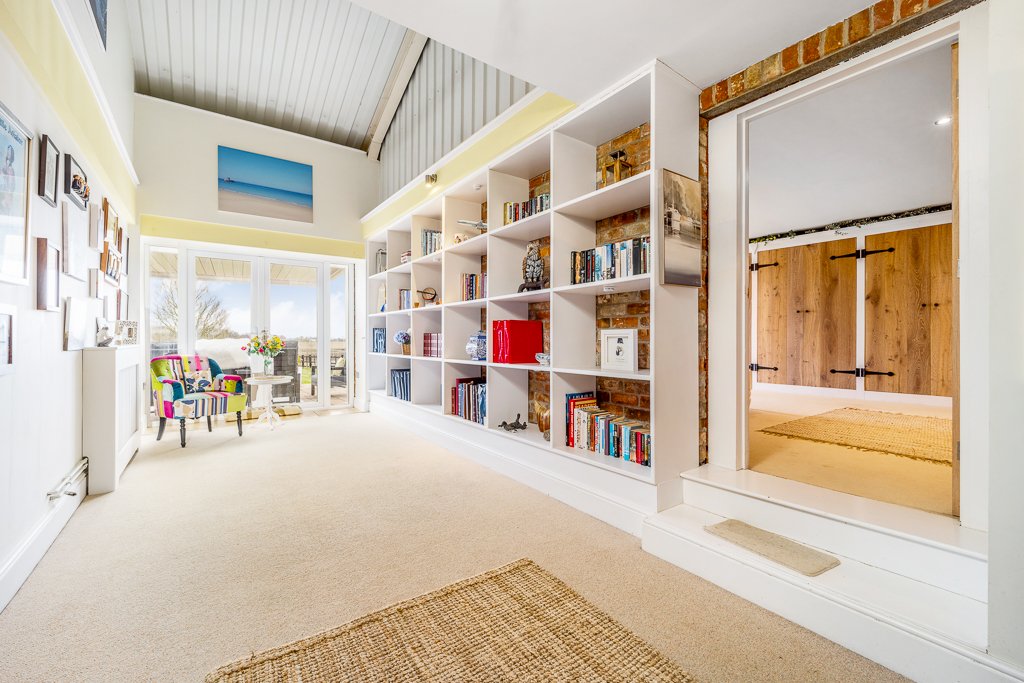 - L-shape hallway with vaulted ceiling, furnished with open square shelving, generous reception space and French doors to the rear terrace