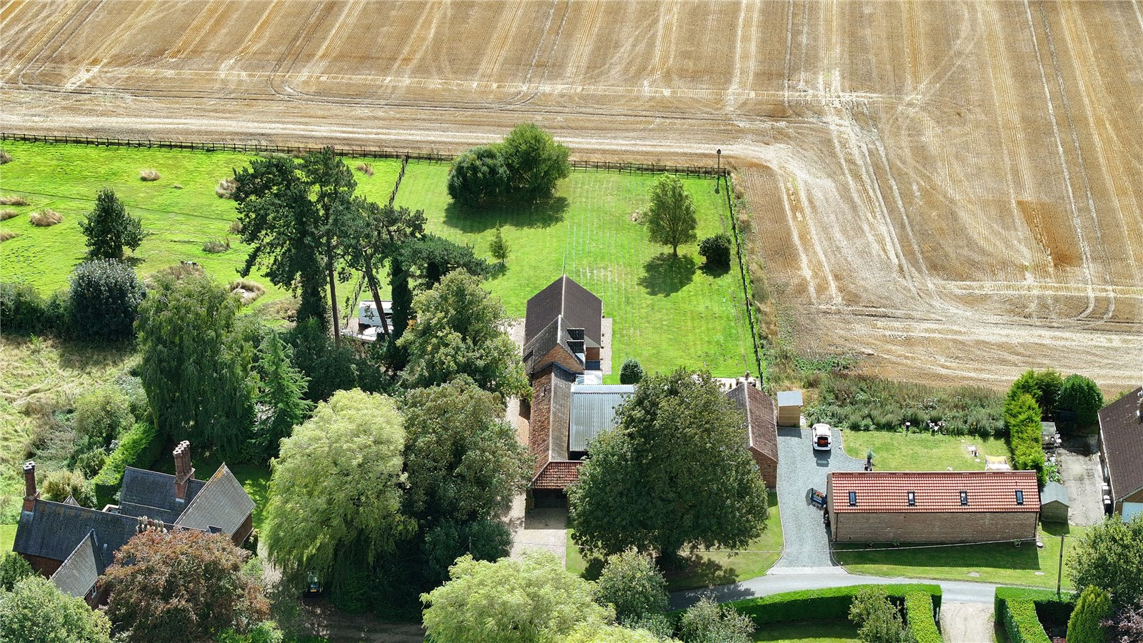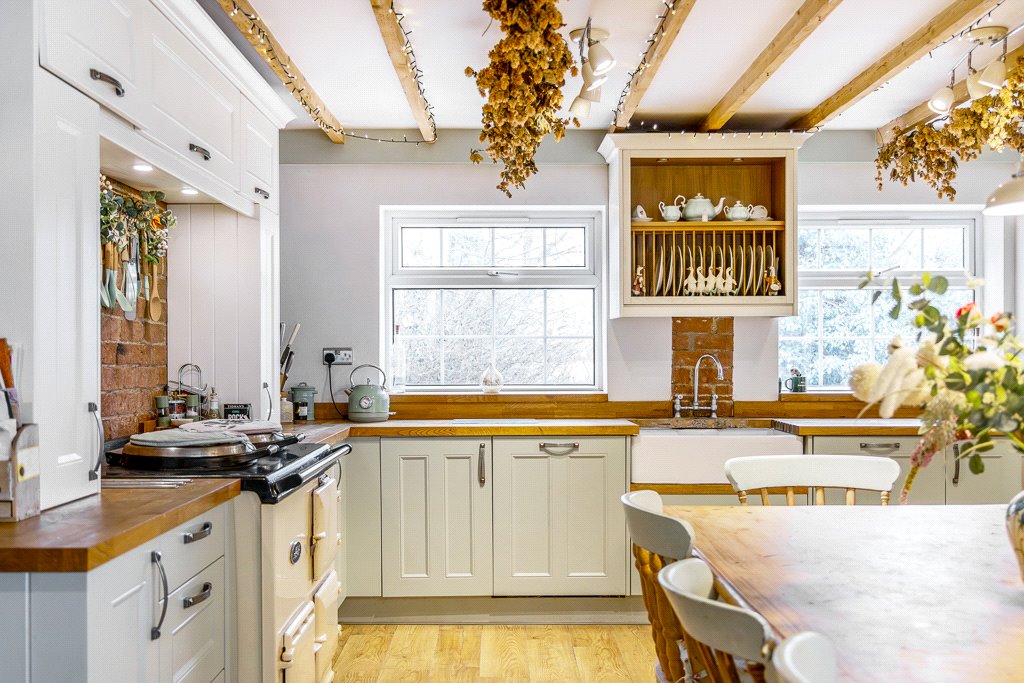 The property is approached by a gravel driveway providing ample parking and a triple garage. The idyllic grounds include formal lawns and a meadow paddock, perfect for those with equestrian or small holding interests.