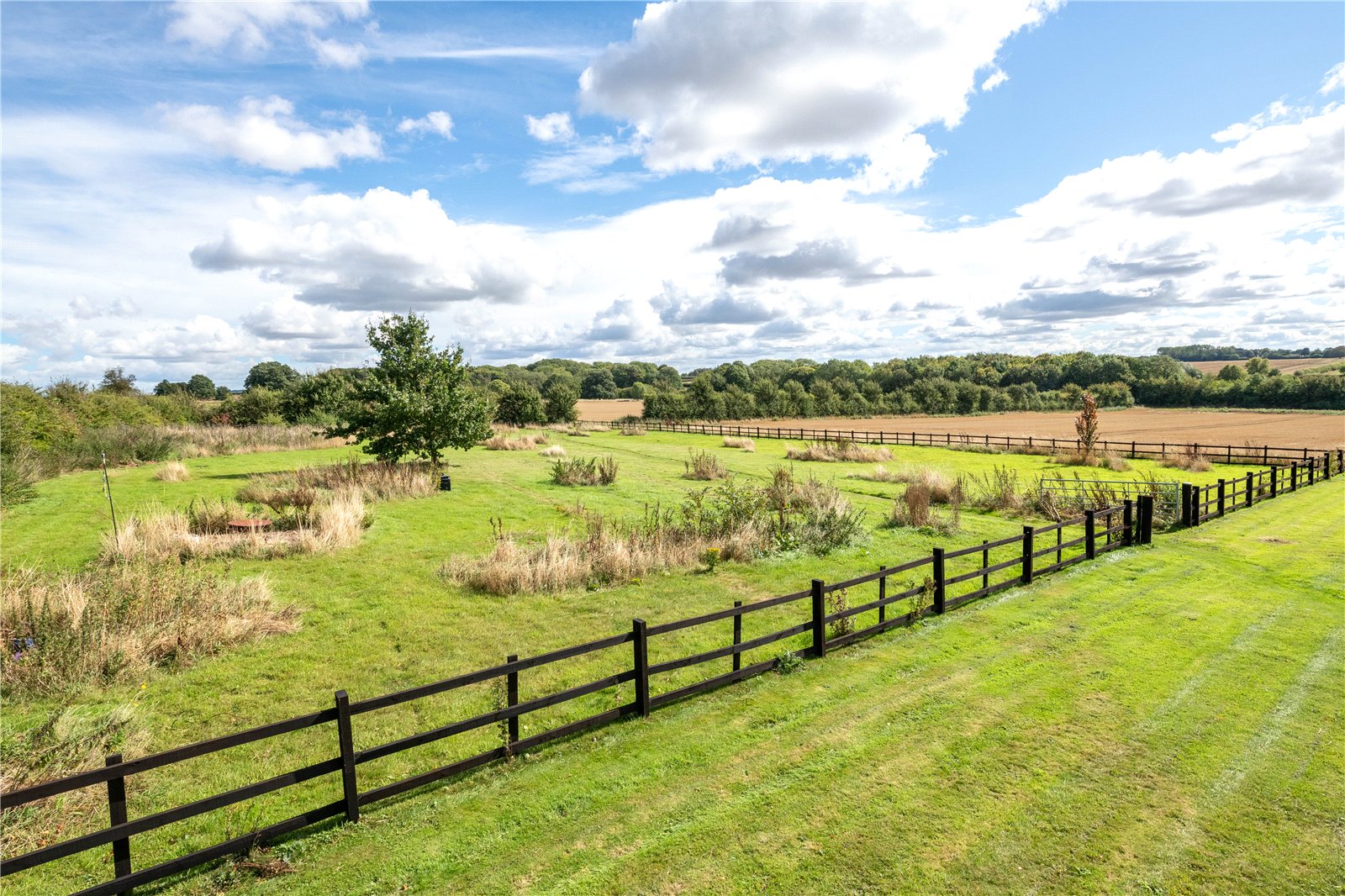 • The meadow paddock, to the East of the formal lawn is accessed via a gate with post and rail fencing