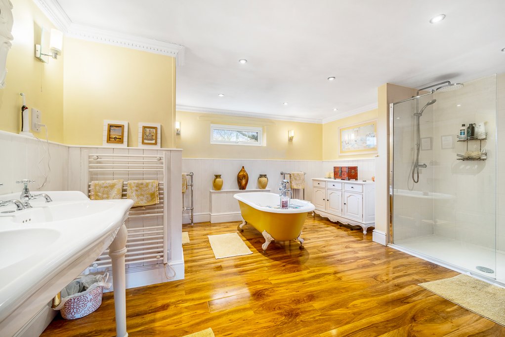 • Ensuite bathroom with free standing bath on ball and claw feet to the centre and separate double shower