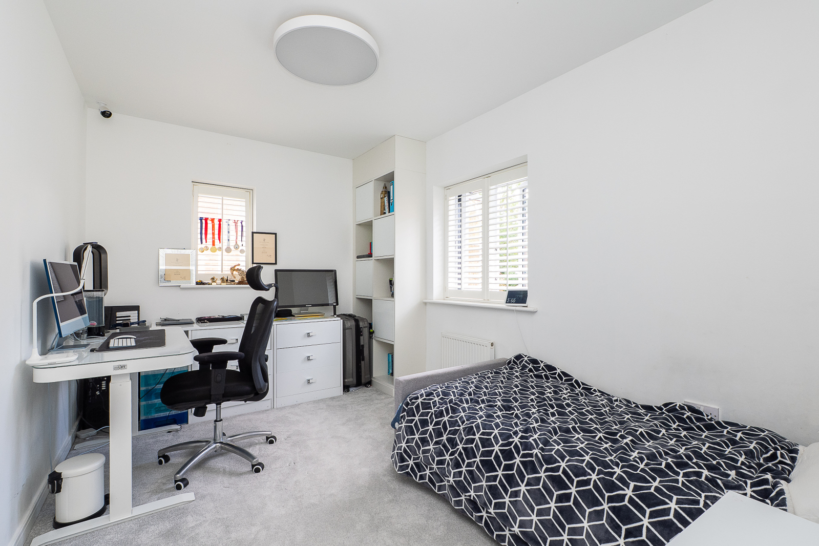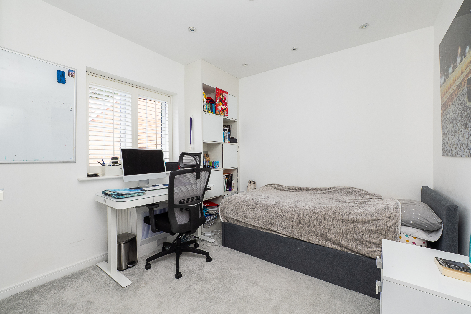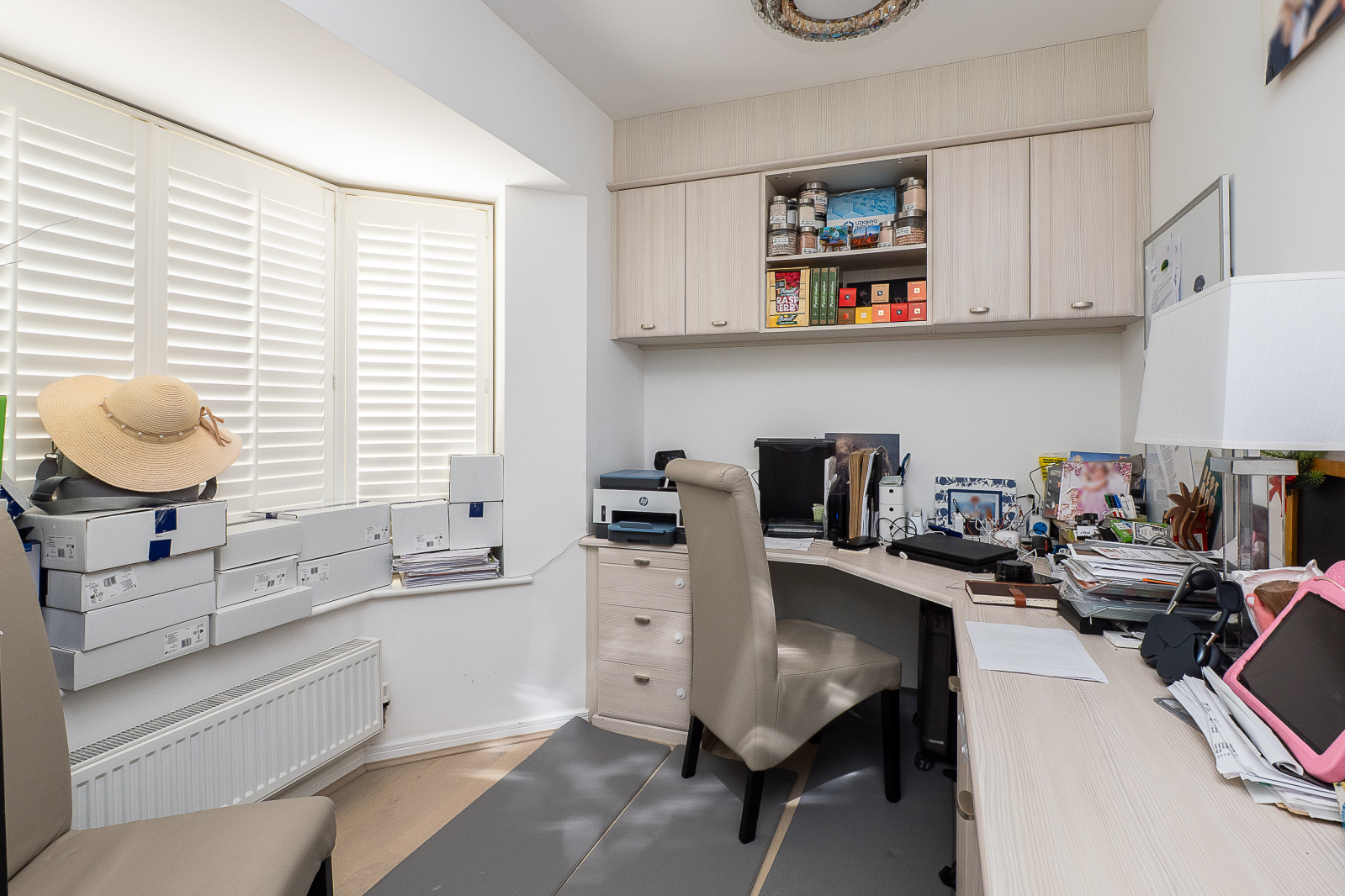 The first floor boasts three spacious double bedrooms, one benefiting from a sleek en-suite shower room, and a modern family bathroom with a separate shower cubicle. The fourth bedroom on this level has been transformed into a stylish walk-in wardrobe, featuring high-quality Hammonds fitted storage.