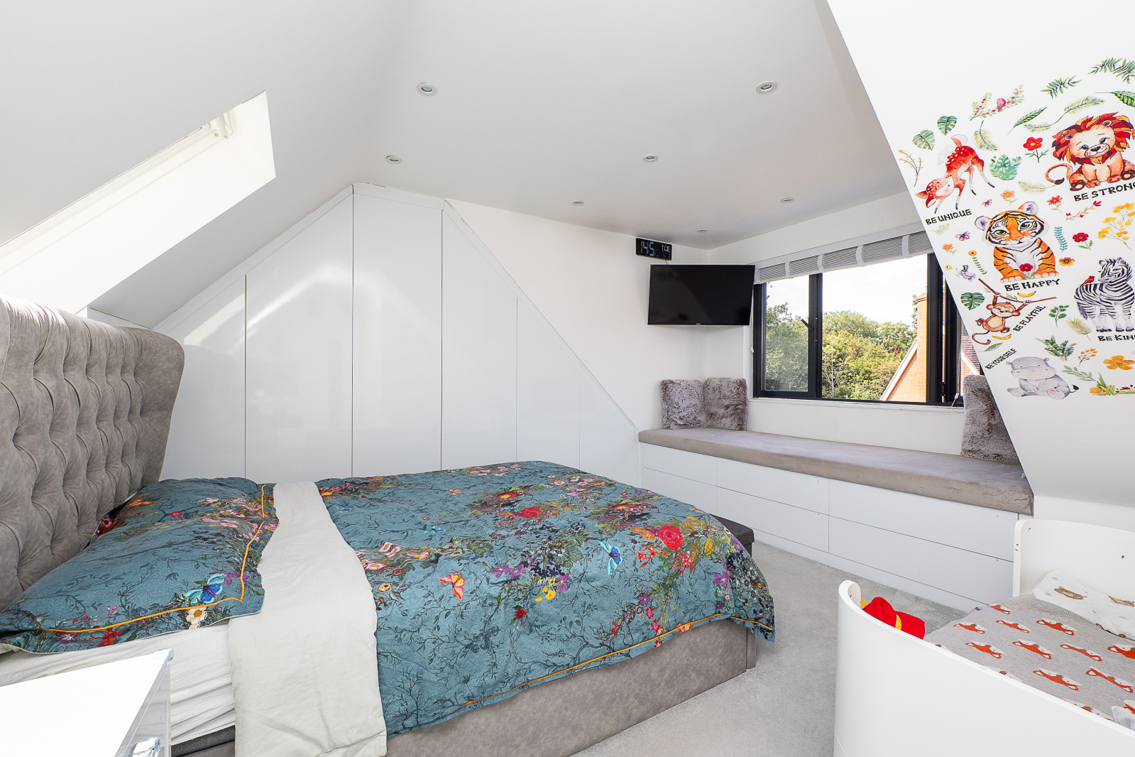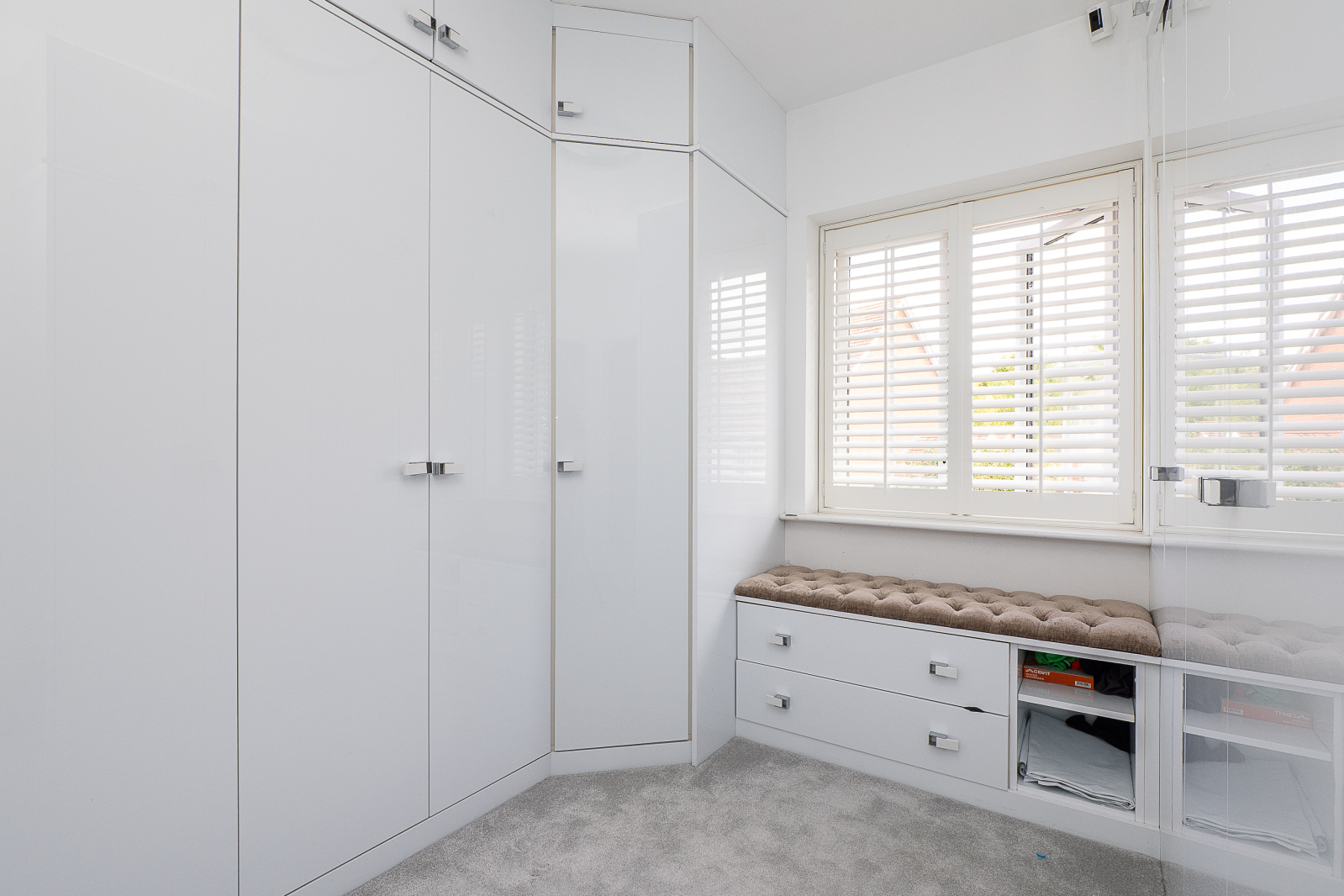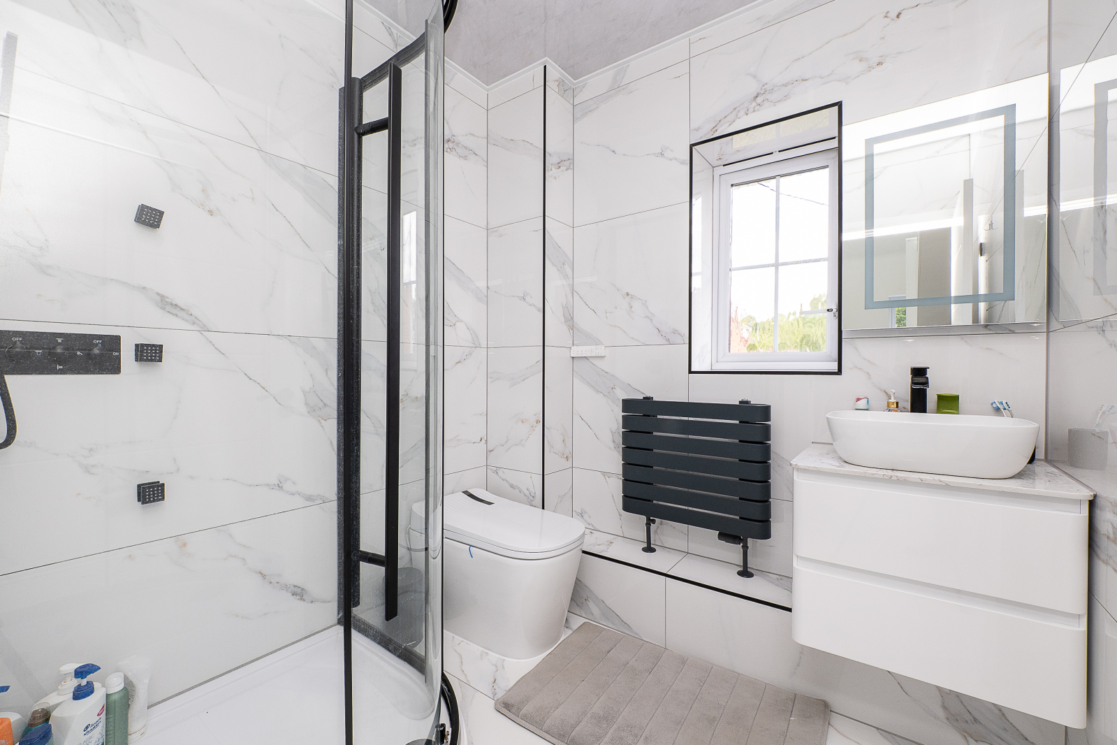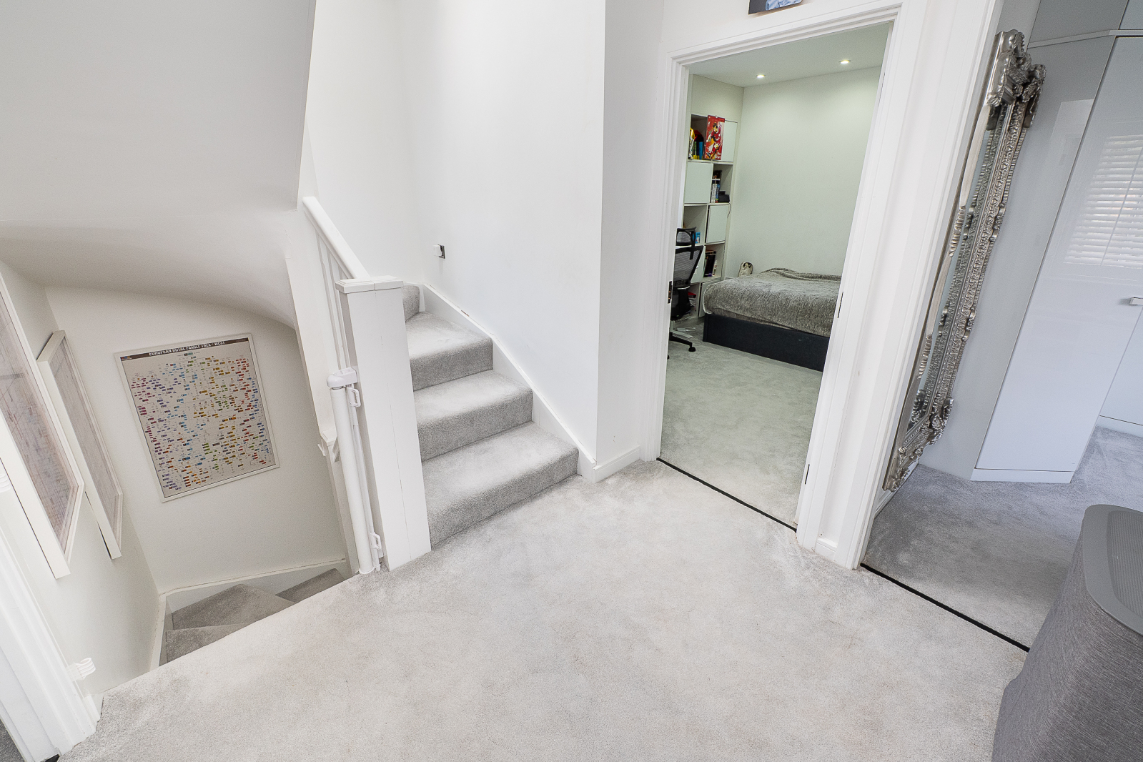 The first floor boasts three spacious double bedrooms, one benefiting from a sleek en-suite shower room, and a modern family bathroom with a separate shower cubicle. The fourth bedroom on this level has been transformed into a stylish walk-in wardrobe, featuring high-quality Hammonds fitted storage.