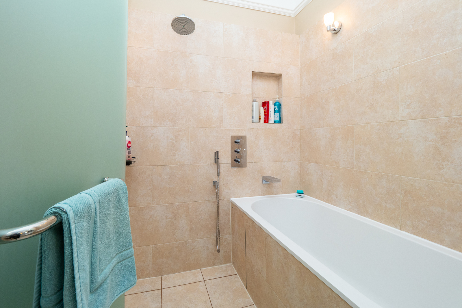 The fitted modern kitchen seamlessly integrates contemporary conveniences complemented by some integrated appliances and space for a small table. The luxurious bathroom adorned with premium fittings, is designed along the lines of a Japanese 'Onsen' and features a full wetroom with rain shower and Villeroy and Boch deep bathtub.