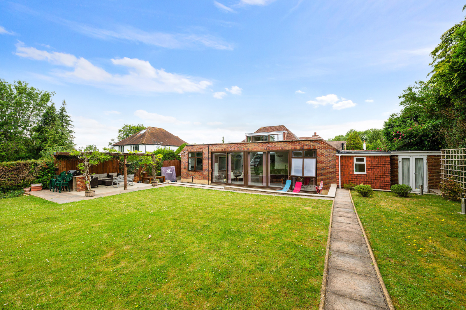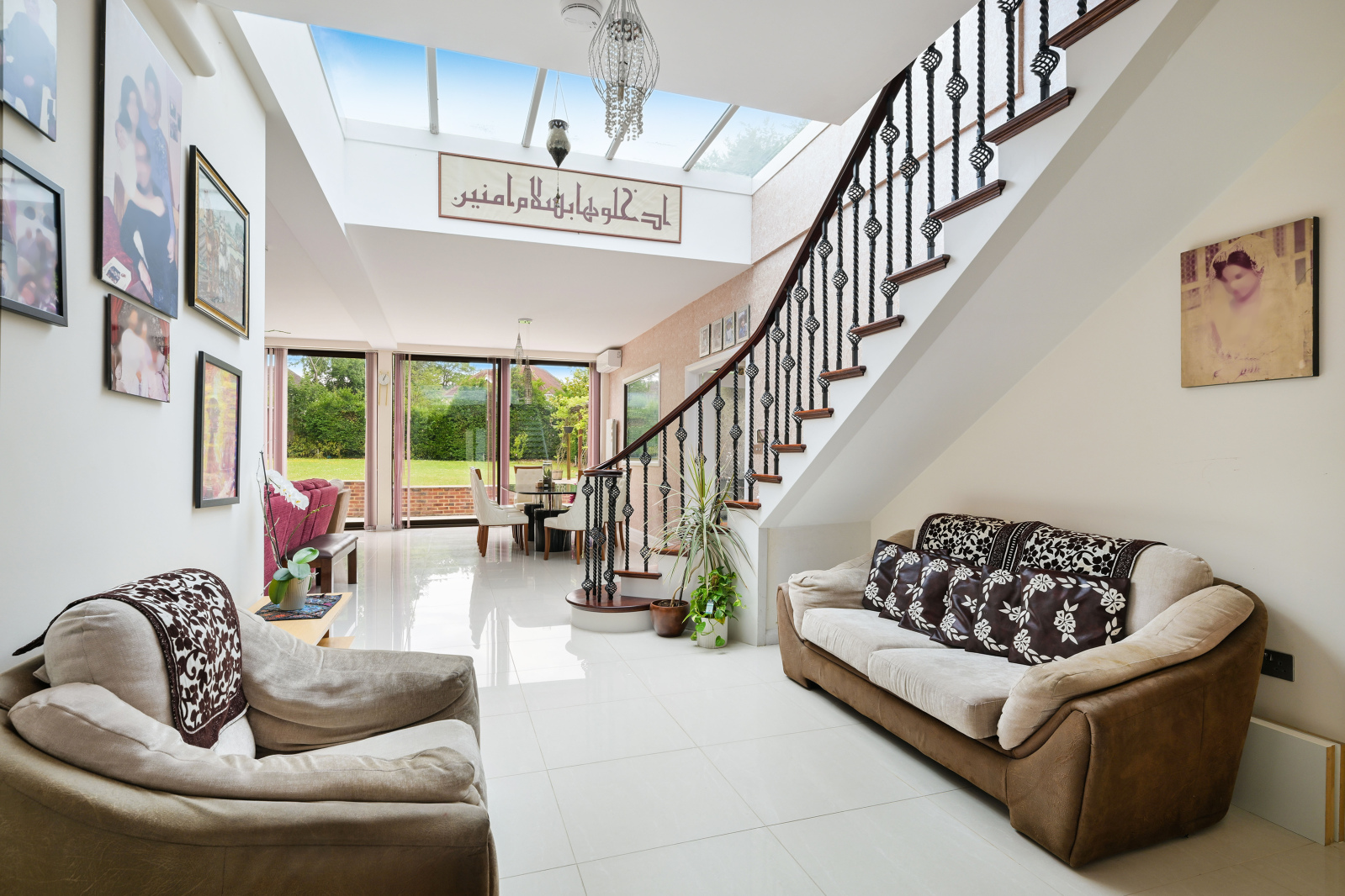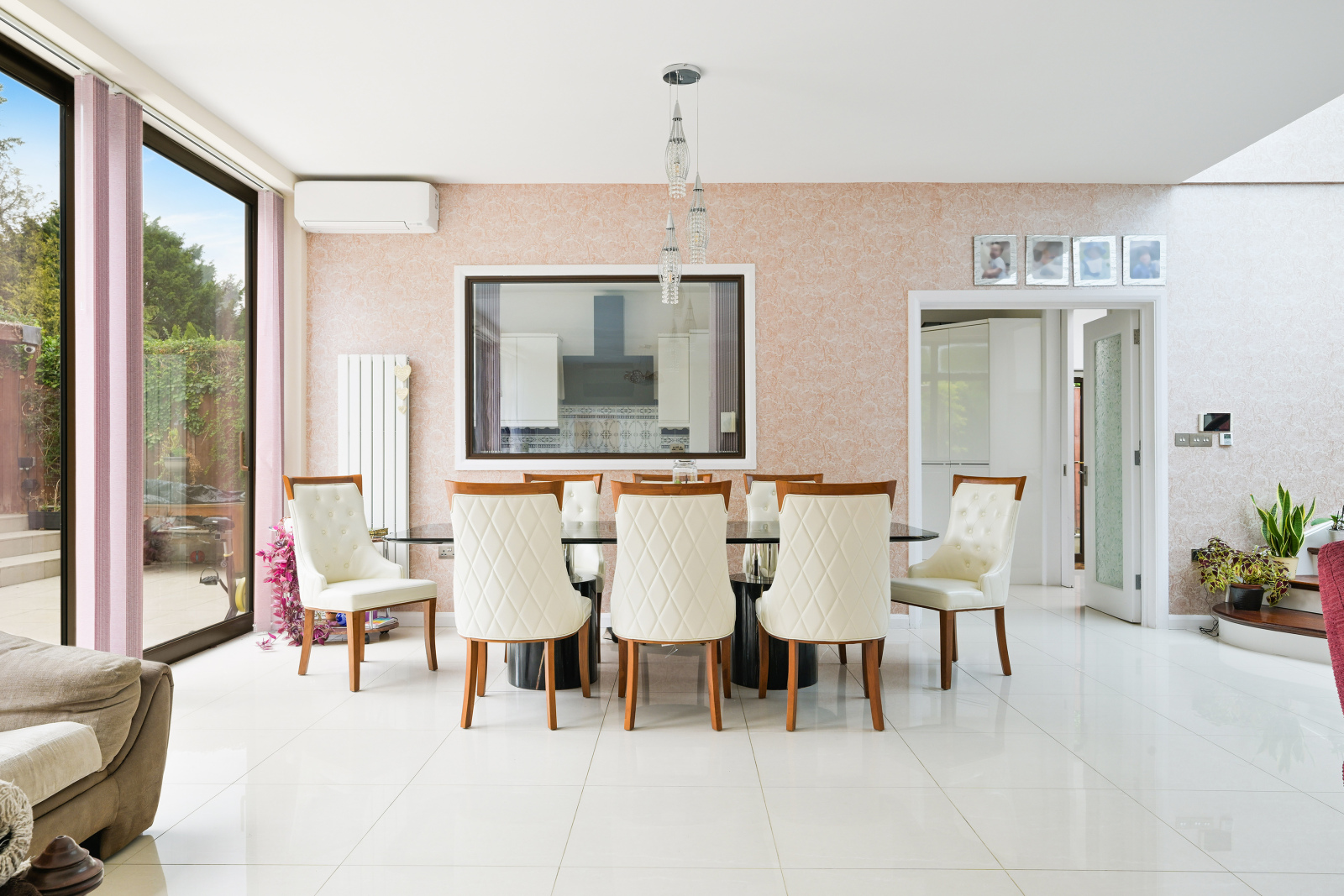 As you enter, you are greeted by an impressive entrance hallway featuring a grand staircase that sets the tone for the rest of the property. The open-plan sitting room and dining room are enhanced by four large sliding patio doors that seamlessly connect the interior to the secluded South West facing garden, creating an ideal space for entertaining or enjoying serene outdoor moments.