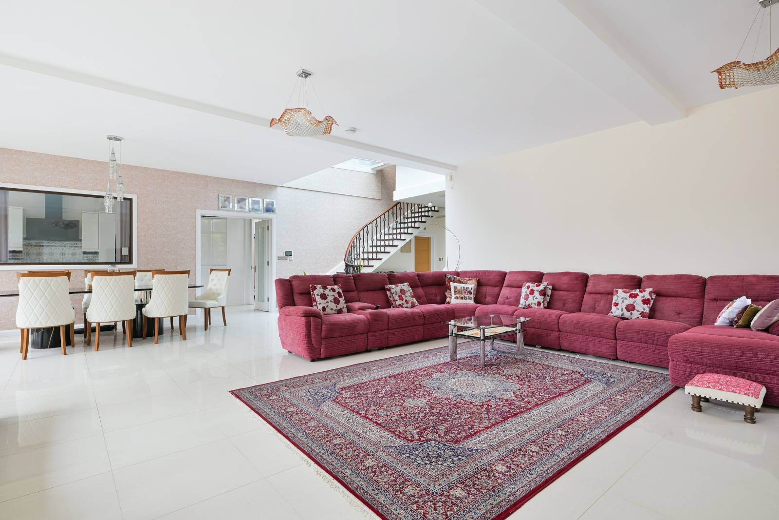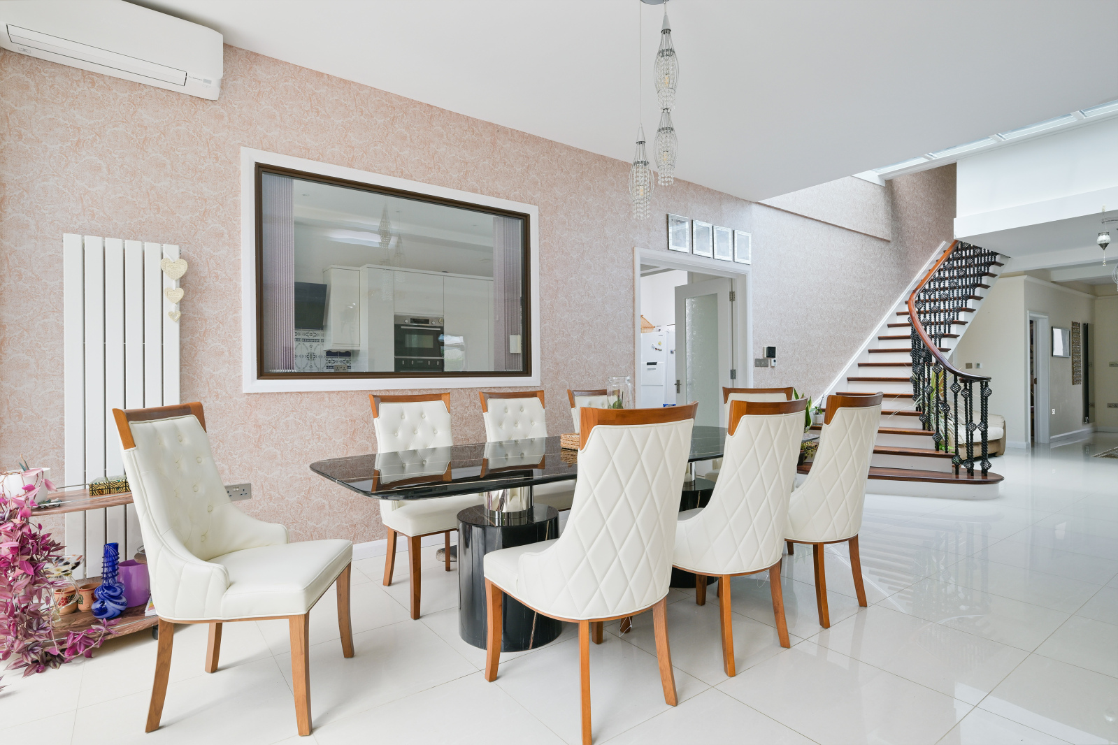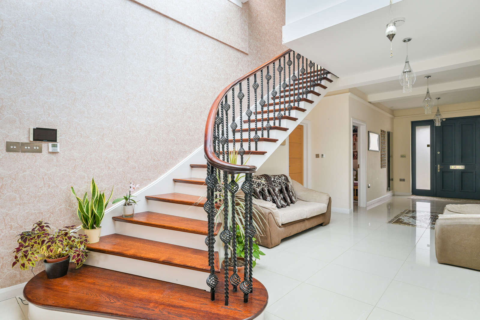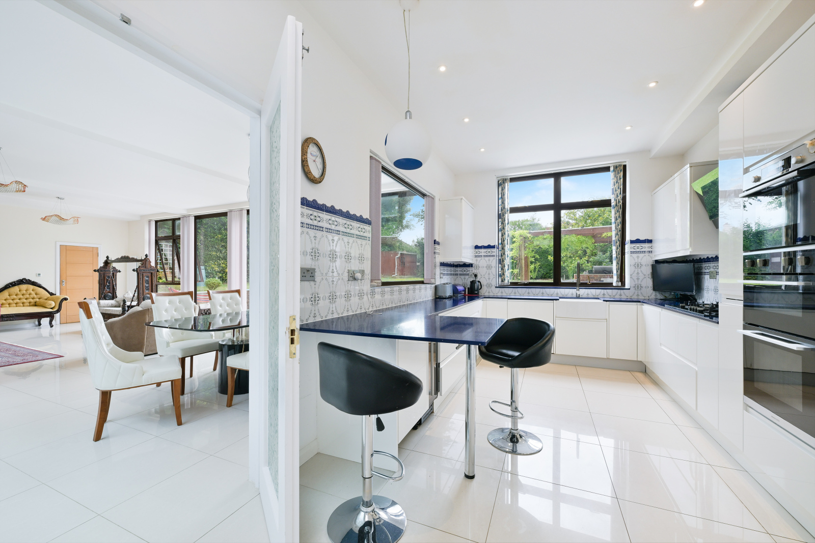 As you enter, you are greeted by an impressive entrance hallway featuring a grand staircase that sets the tone for the rest of the property. The open-plan sitting room and dining room are enhanced by four large sliding patio doors that seamlessly connect the interior to the secluded South West facing garden, creating an ideal space for entertaining or enjoying serene outdoor moments.
