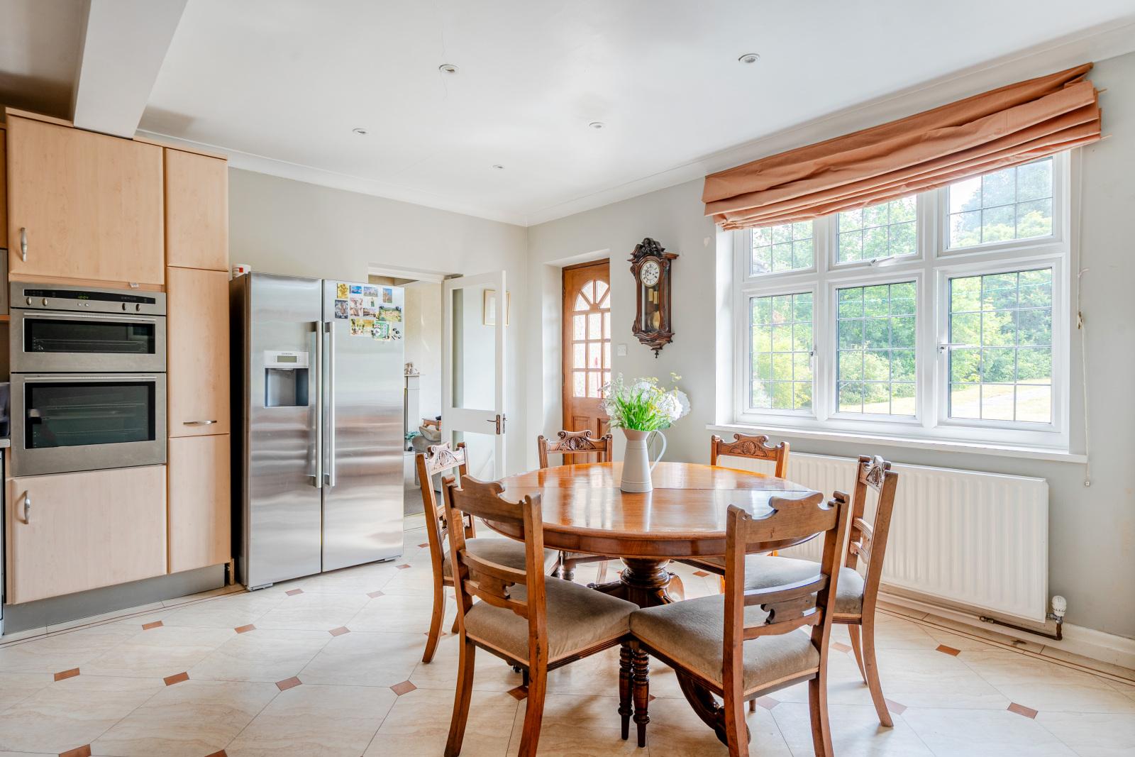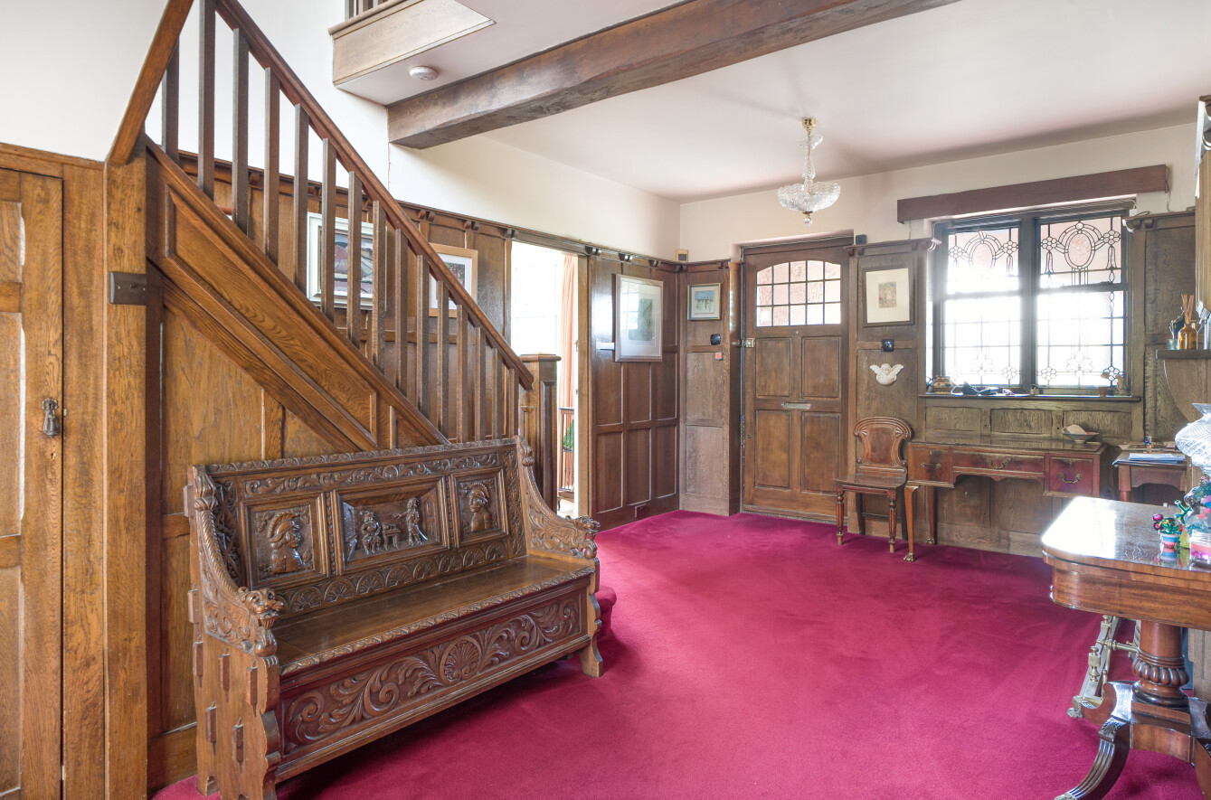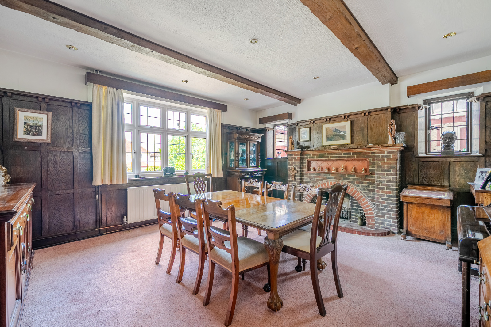 The character-rich dining room, adorned with stunning wood panelling and dual-aspect windows, sets the perfect scene for memorable meals, while the separate fitted kitchen/breakfast room floods with natural light and offers delightful views of your expansive, private garden. The cosy reception room, currently a TV haven, is flexible enough to suit your needs and features convenient access leading to the garage.