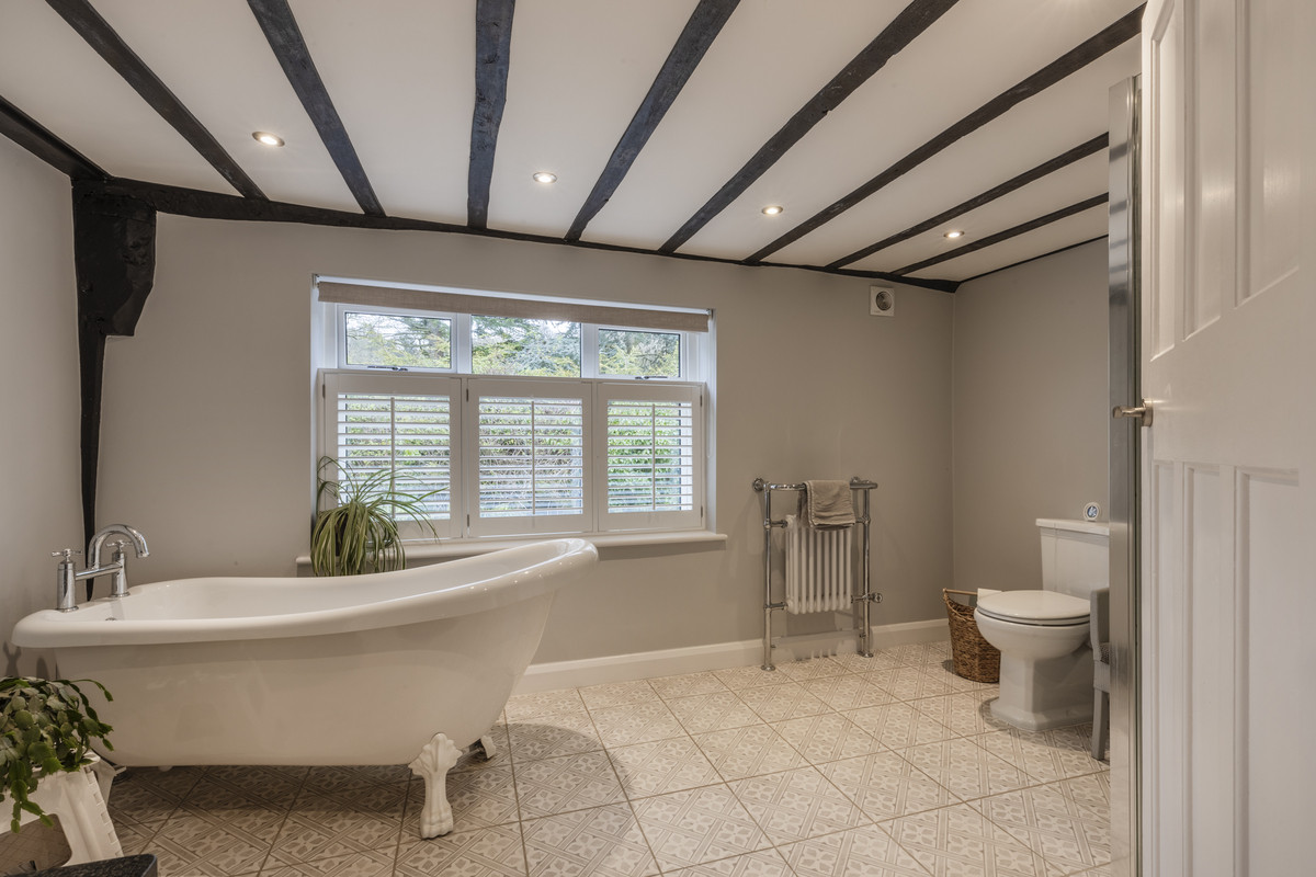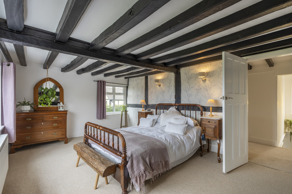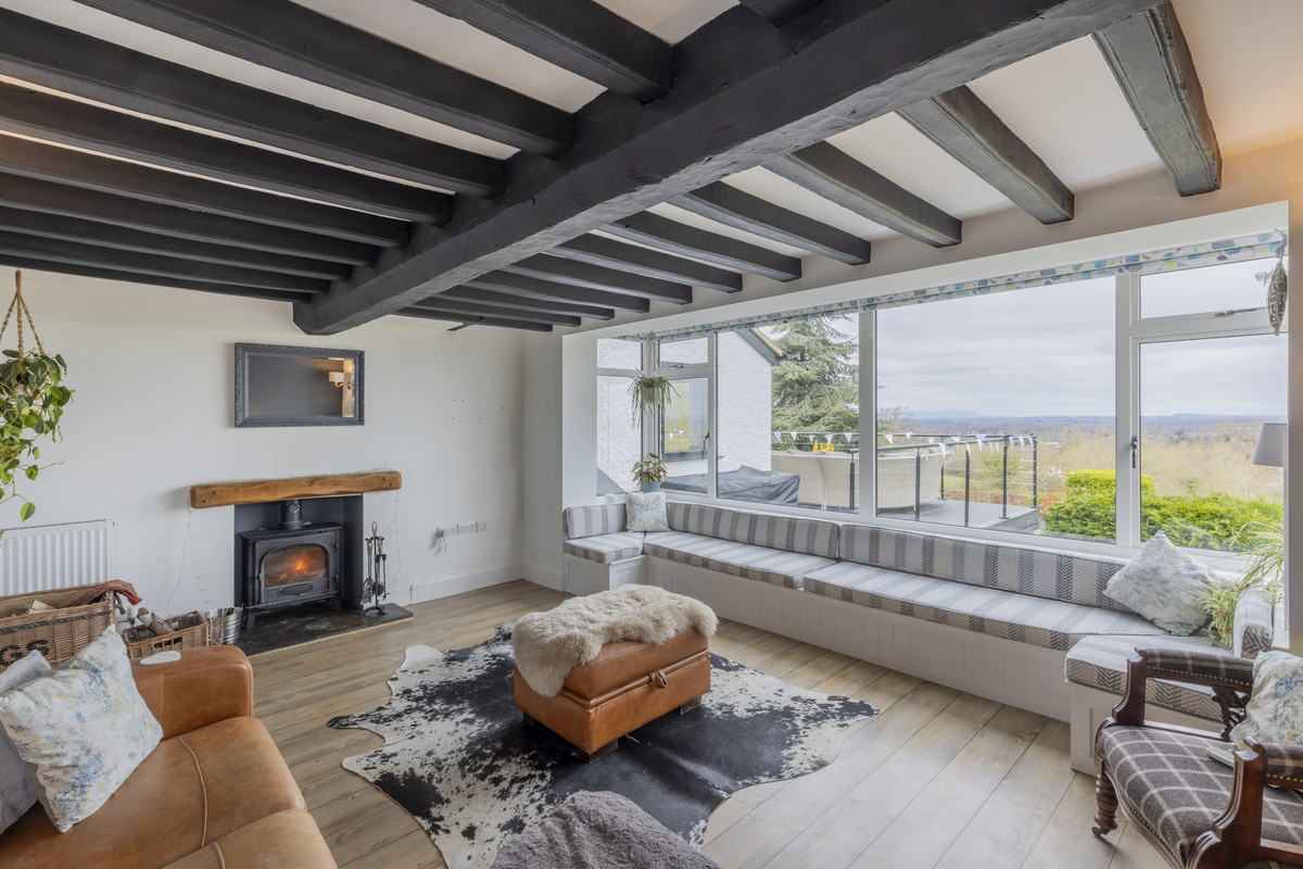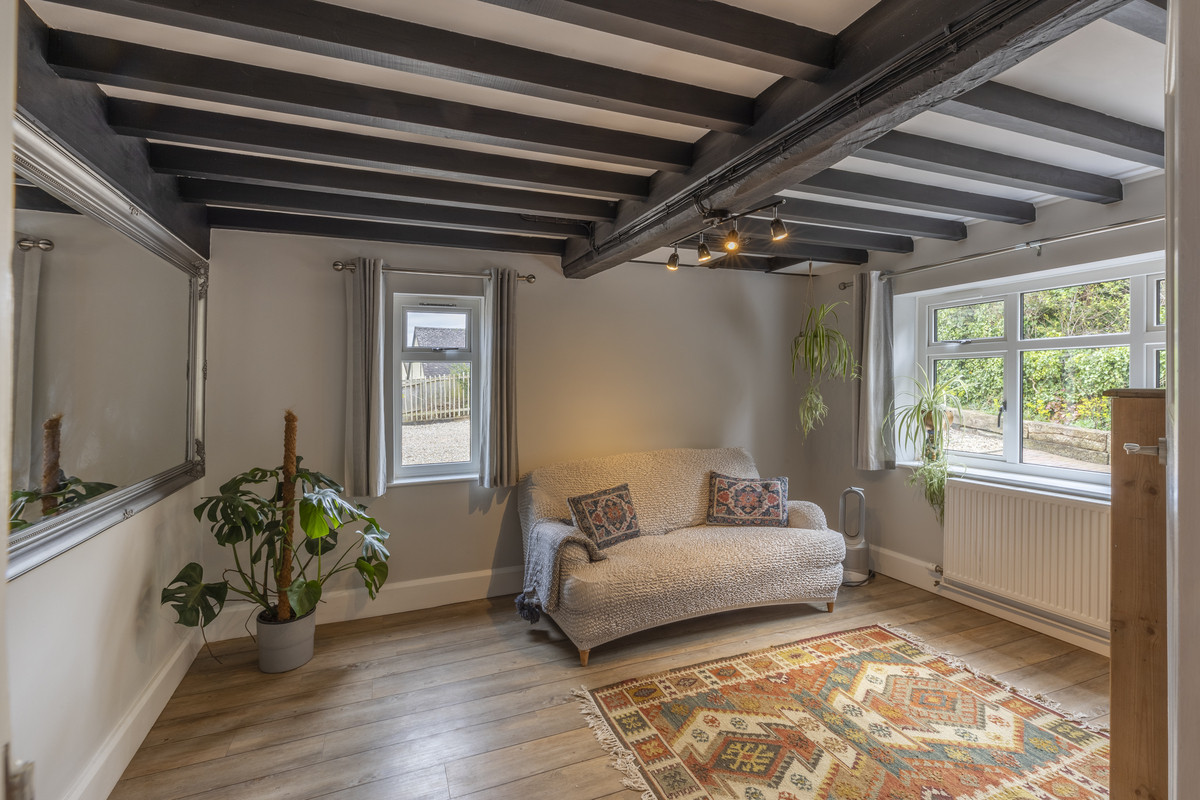 Upon entering, this inviting reception hall sets the stage for the home’s warm and welcoming atmosphere. Leading off from here is a beautifully appointed drawing room, where exposed beamed ceilings and a charming bay window frames breathtaking views of the surrounding open countryside, creating a cosy yet elegant space to relax.