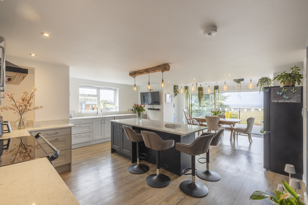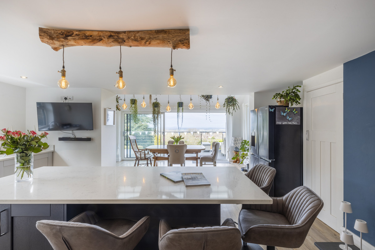 An elegant and versatile formal dining room/study/family room adds to the character of the home, featuring striking beams that enhance its warmth and appeal. This flexible space is perfect for entertaining, working from home, or unwinding with family. At the heart of the home lies a stunning open-plan kitchen, thoughtfully designed with an island, breakfast bar, and spacious dining area.