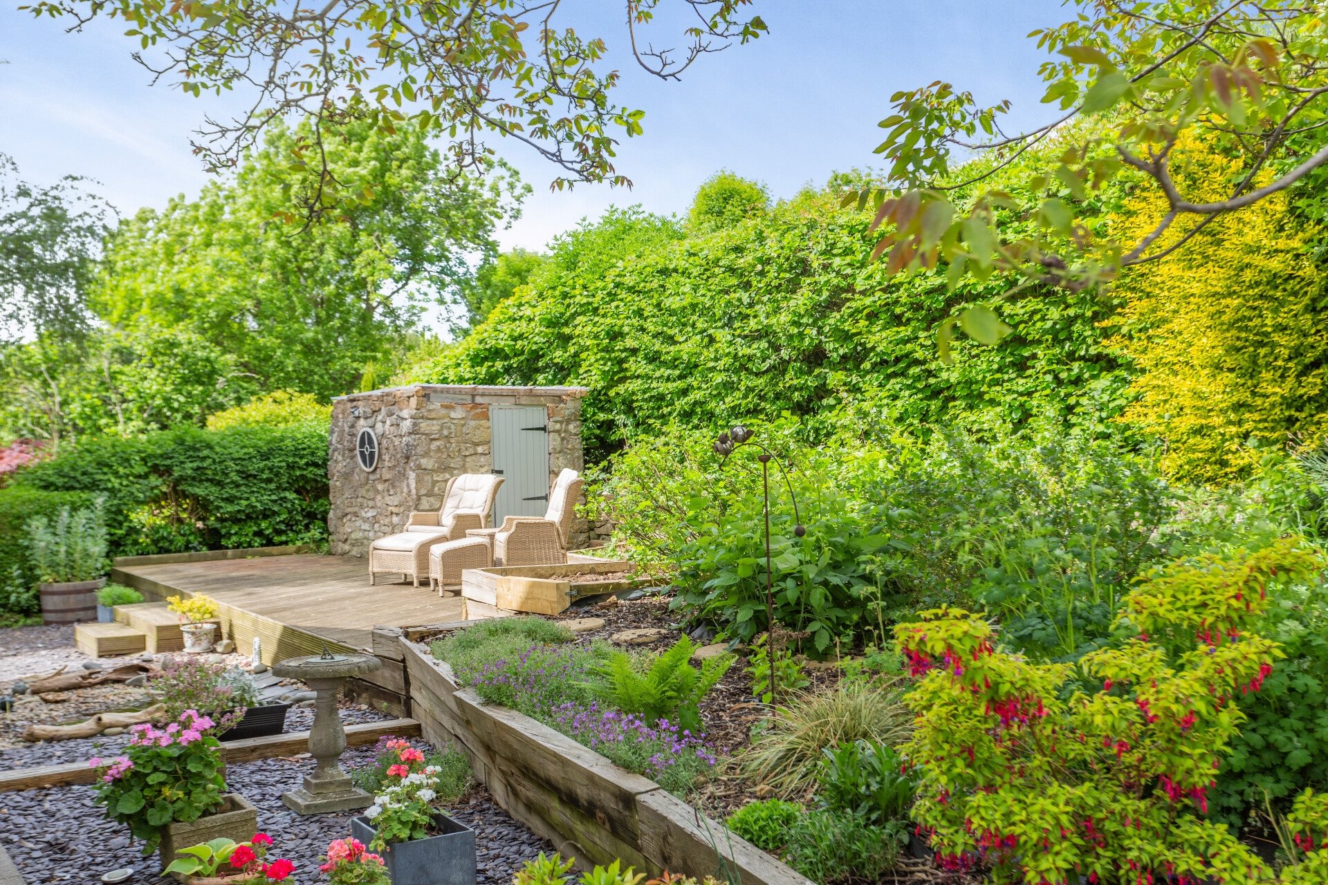 The garden beyond is perfect for entertaining and has been created to be low maintenance, with a gravelled area with a small fish pond and steps leading to a decked area, with raised beds and a charming stone outhouse, while next to it is a handsome walnut tree enclosed by a metal seat and a shrubbery. The garden is enclosed by an attractive leafy hedge that enhances the feeling of privacy. There's also a small shed along the side of the property.