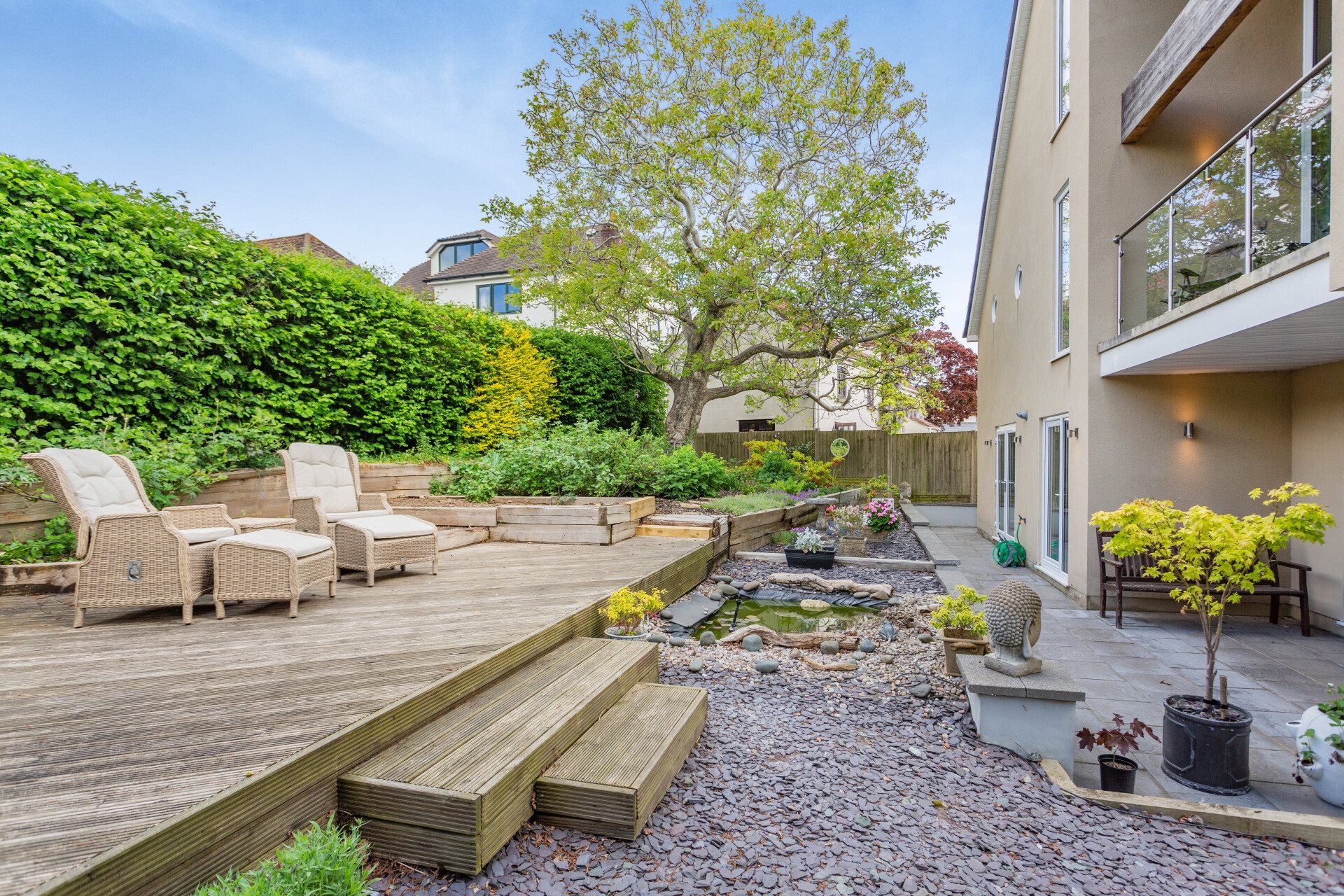 • Patio and low maintenance, multi-level garden with decking, fish pond and out house