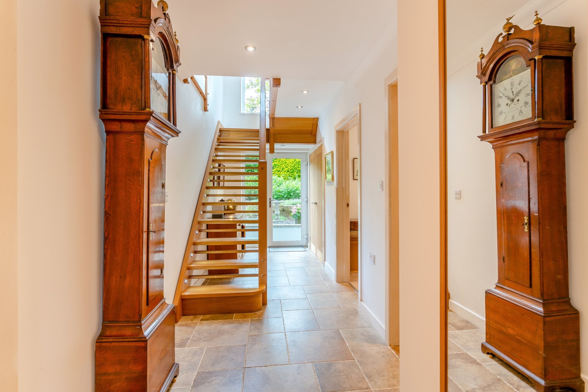 The front door, reached by steps rising from the driveway, leads into a passage-like hallway with a practical tiled floor, off of which lies the three bedrooms, a bathroom and a utility room, together with a door into the garden and an elegant, bespoke oak staircase.