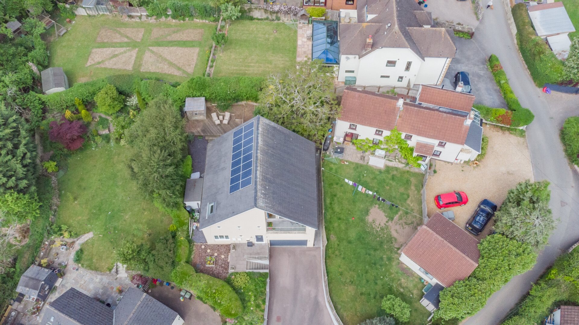 Extensive solar panels on the south-facing slate roof contribute to the energy needs of the property.
