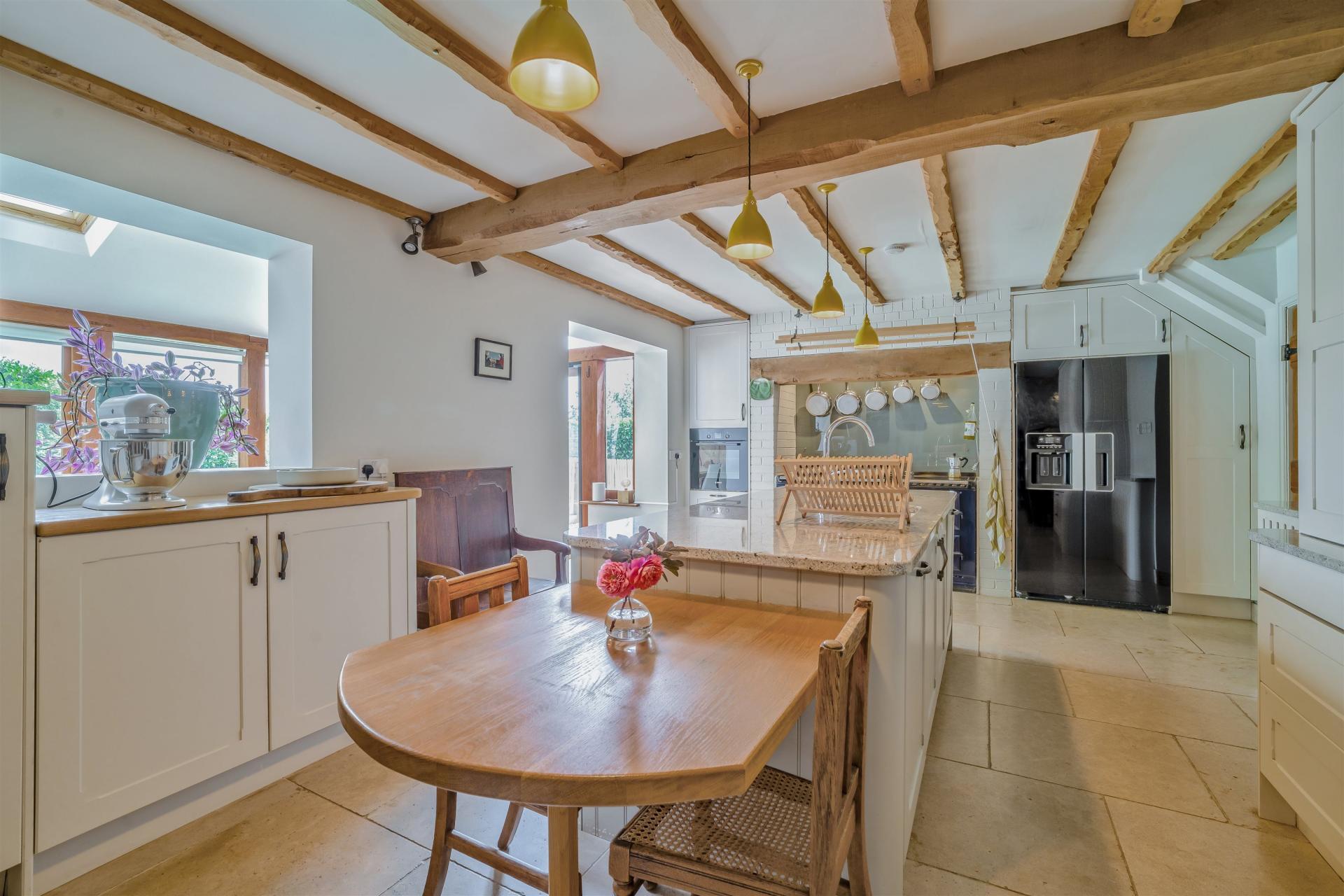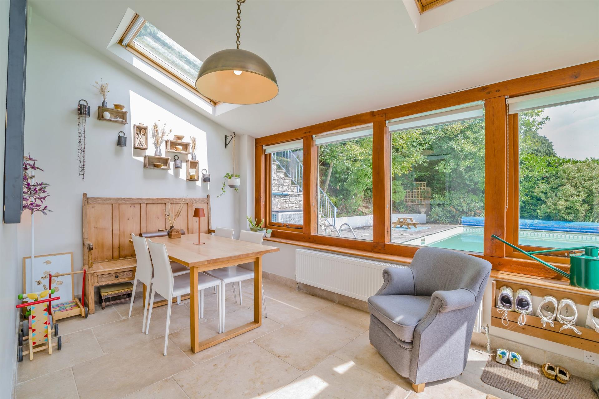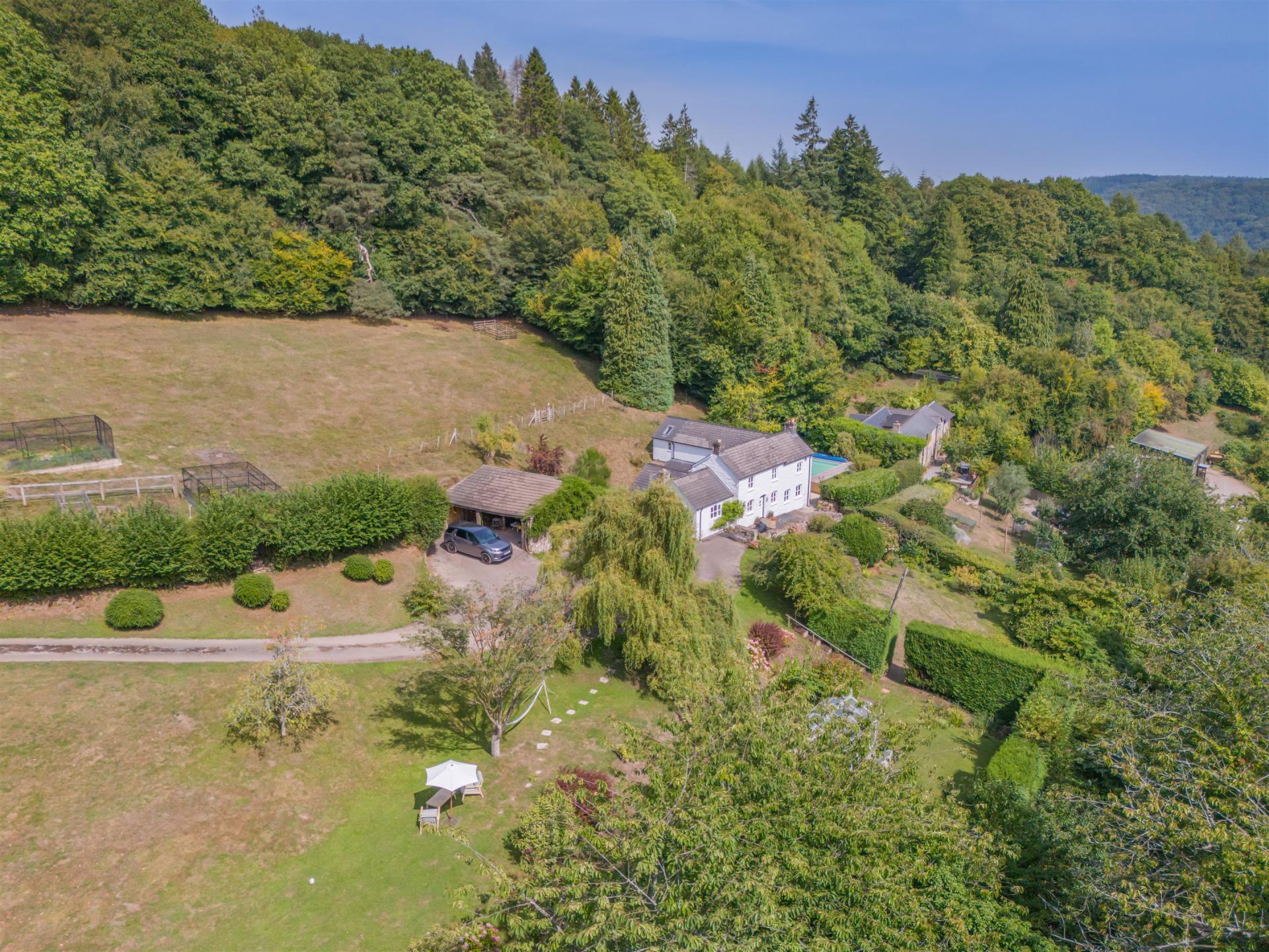 Halewood is a blend of an old cottage and thoughtful extensions that come together to create a spacious home offering privacy, space and beauty that's perfect for modern life. Features such as wooden beams and exposed stone provide plenty of old-world charm. The characterful stable-door entrance leads into a welcoming dining room with a fire place, built-in cupboards, ceiling beams and solid oak flooring that extends to adjacent rooms, with the original staircase tucked away in a corner. To one side of this area is a cosy snug with an exposed stone fireplace fitted with a new Penguin woodburner. With lovely views of the garden, this space is currently used as a music room. A hallway with stone walls, solid oak flooring floor and a bespoke oak staircase lies off the dining area. Steps lead into a large living room, which has a woodburning stove and French windows that let in plenty of light. Also off the hallway you will find the downstairs cloakroom. On the other side of the hall there's a roomy kitchen/dining area, with ceramic-tiled floor and wooden units made by Cymru Kitchens. There's a large AGA range, freestanding companion with a hob, fitted Bosch electric oven and an American-style fridge. A Franke sink and Quooker instant boiling water tap sit in the granite-topped island. An oak-framed garden room next to the kitchen is the perfect spot to soak up the sunshine, with French doors opening onto views of the heated outdoor swimming pool, the terraces, and the treetops of the Wye Valley beyond. This room's Mandarin stone floor continues into the utility room, with fitted cupboards, wooden work surfaces and Belfast-style sink, with space and plumbing for a washing machine and dryer. The main bedroom has an en suite bathroom with a shower, fitted wardrobes and a private terrace with beautiful views of the swimming pool towards the valley. Steps lead from this terrace to the heated swimming pool and sun terrace. There are two other double bedrooms with their own unique characters and styles, one with a fitted wardrobe, and a family bathroom. An airing cupboard sits at the top of the stairs. The current owners have undertaken an extensive refurbishment of the property, making it ready for new owners to move straight into.