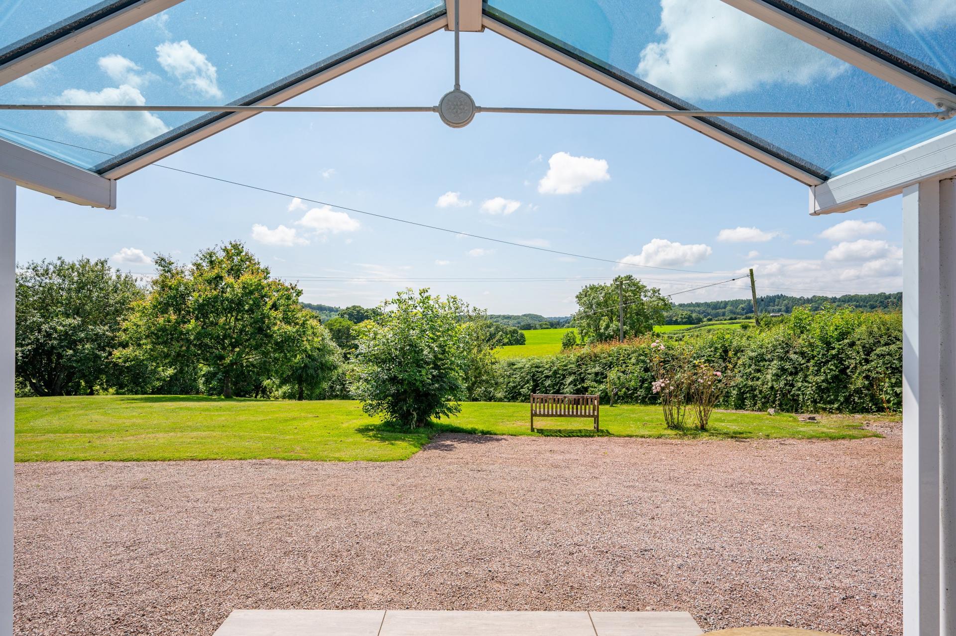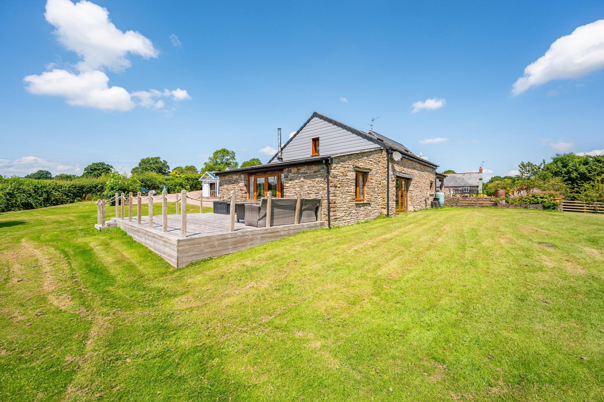 Outside - Poplars Barn is surrounded by mature gardens, established trees, and sweeping lawns, all framed by the peaceful rhythm of rural Monmouthshire. A wildlife pond enhances the serene atmosphere, while a hot tub under a verandaavailable by separate negotiationoffers a private oasis for relaxation. A paddock of approximately 1.1 acres, with a public footpath along its southern boundary, completes this enchanting setting.