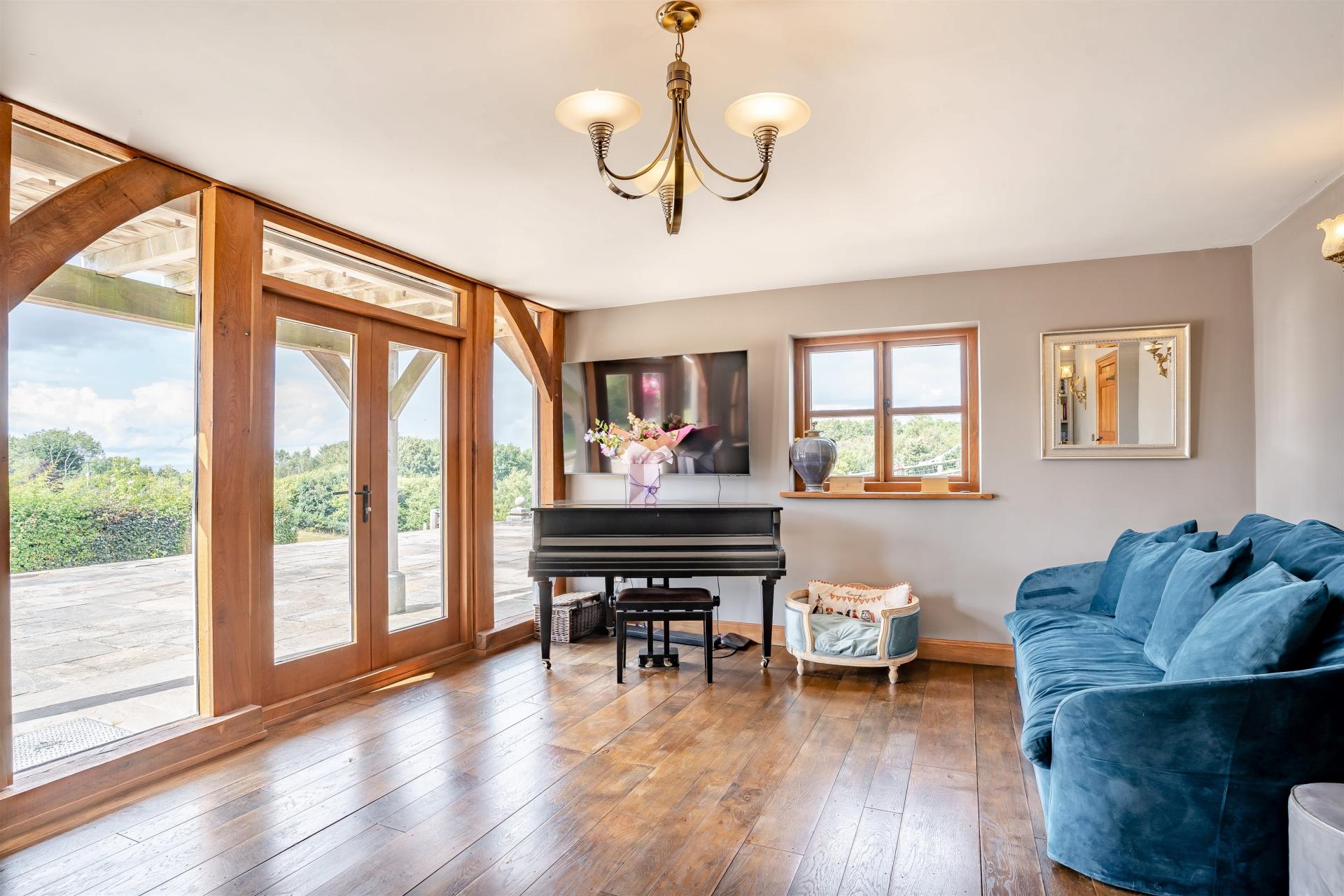 A further reception room offers a more private retreat, featuring exquisite oak doors that open onto a seating area/patio overlooking the equestrian facilities. Bathed in light, this space is perfect for relaxation while taking in the serene, countryside surroundings, offering a unique connection to the property's outdoor lifestyle.