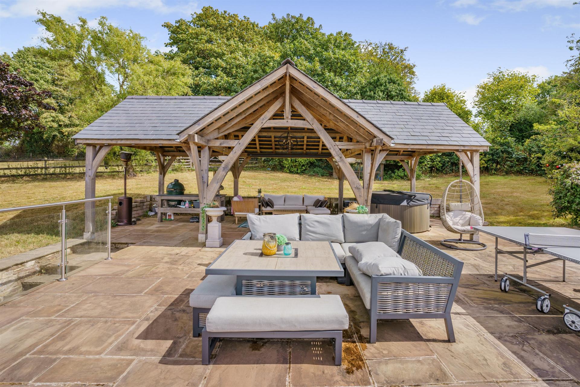 A double garage with ample parking provides both convenience and practicality, while above it, a charming outdoor kitchen with an oak framework and covered roof creates an ideal space for al fresco dining. From summer dinners to cosy autumn gatherings, it blends rustic charm with practical elegance, making outdoor living effortless and inviting.