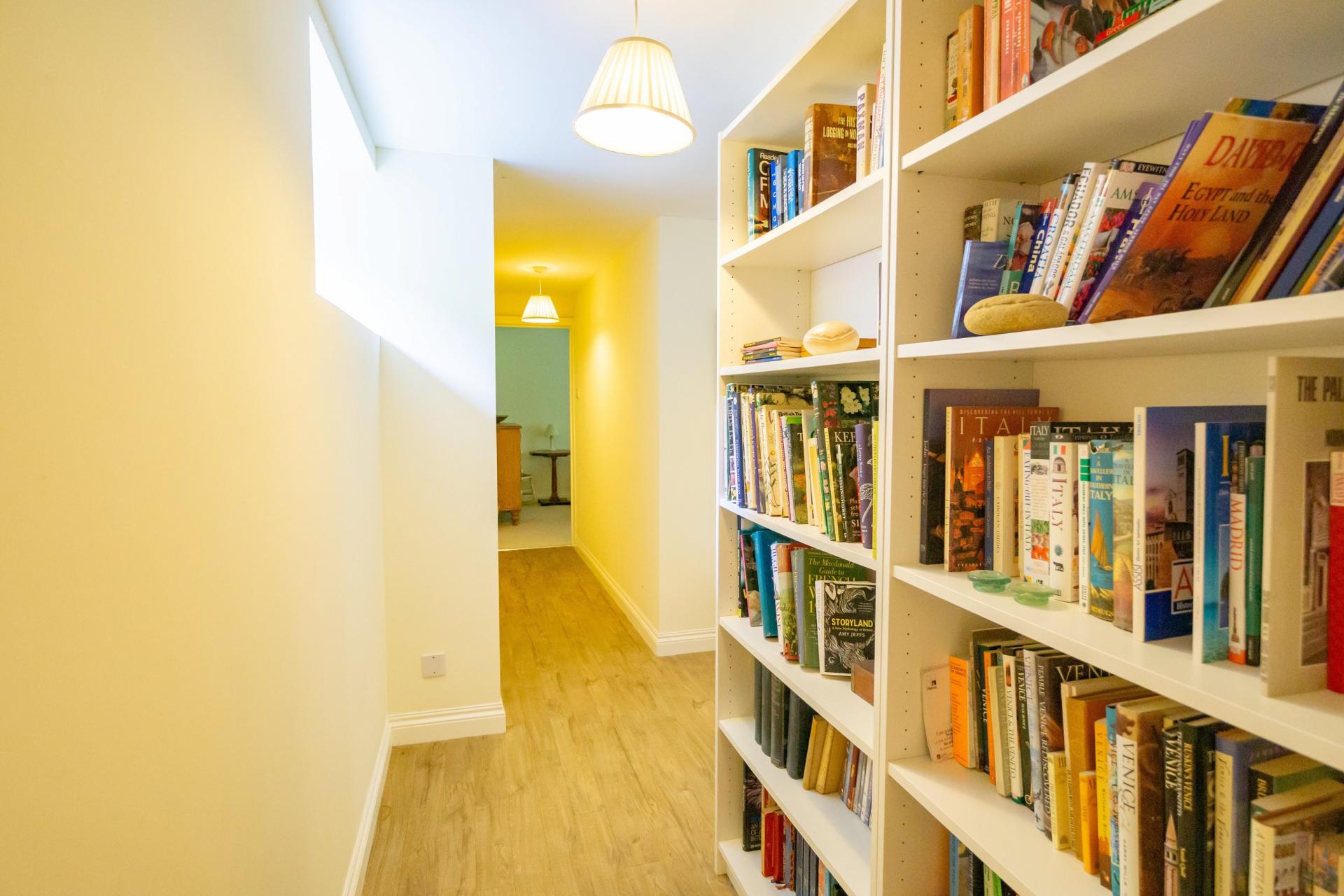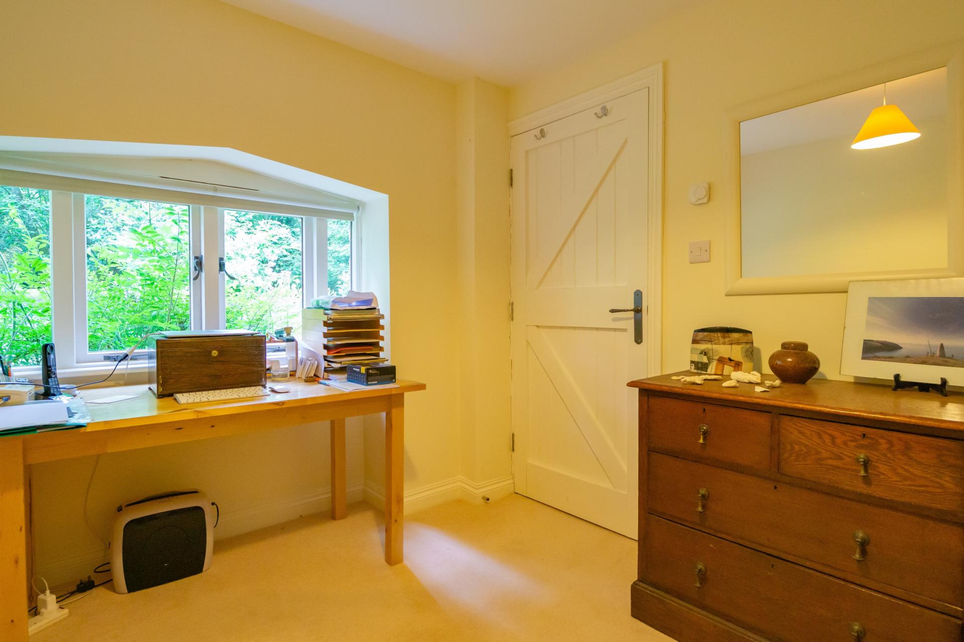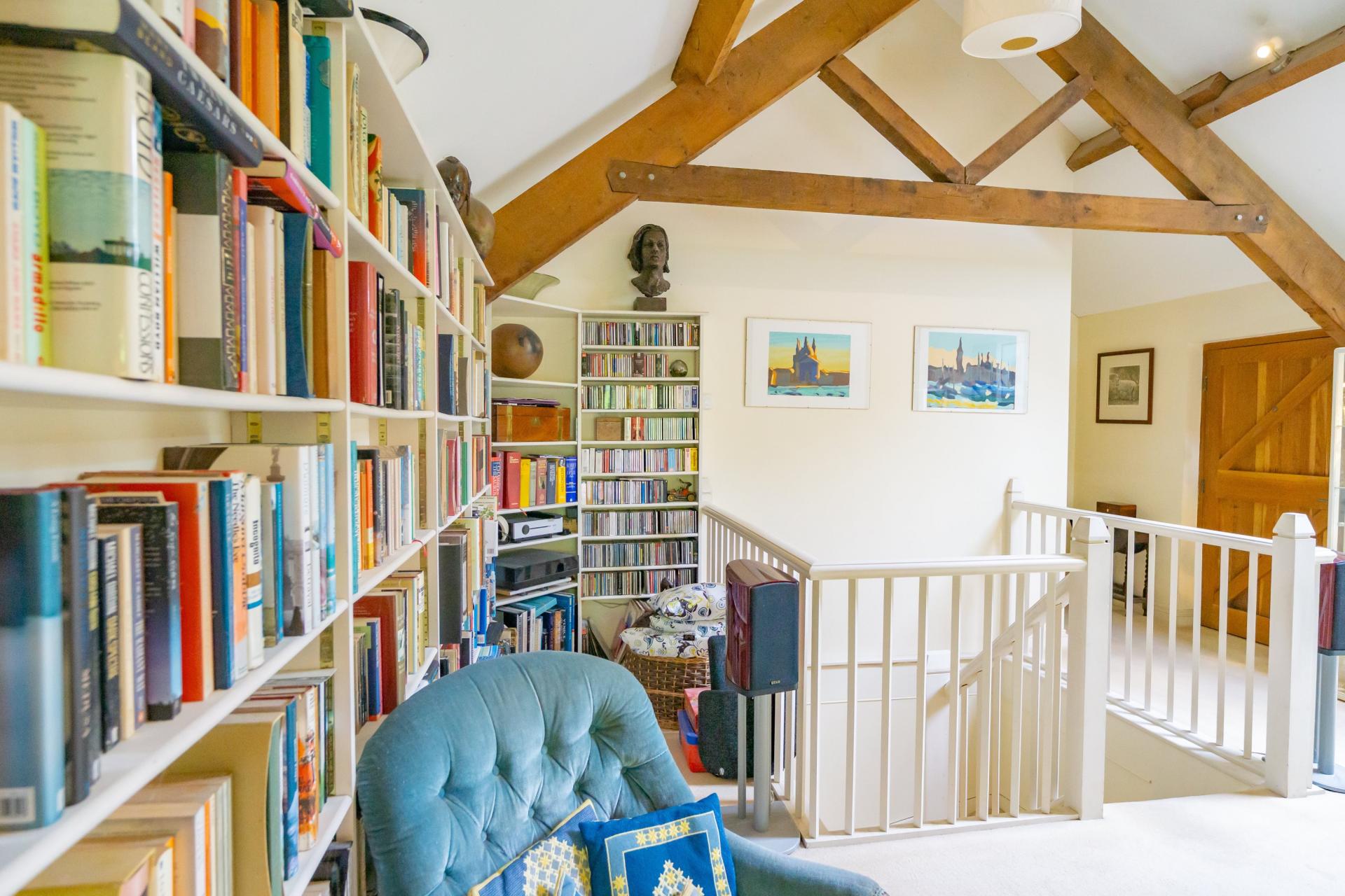 Steps from the kitchen lead to the expansive sitting room, which has plenty of windows to let in the light and frame views of the garden. There's a contemporary recessed woodburner providing warmth and feelings of contentment, while one end of the room has been fitted with useful bookcases. The amount of space available is sufficient to accommodate a dining table if desired.