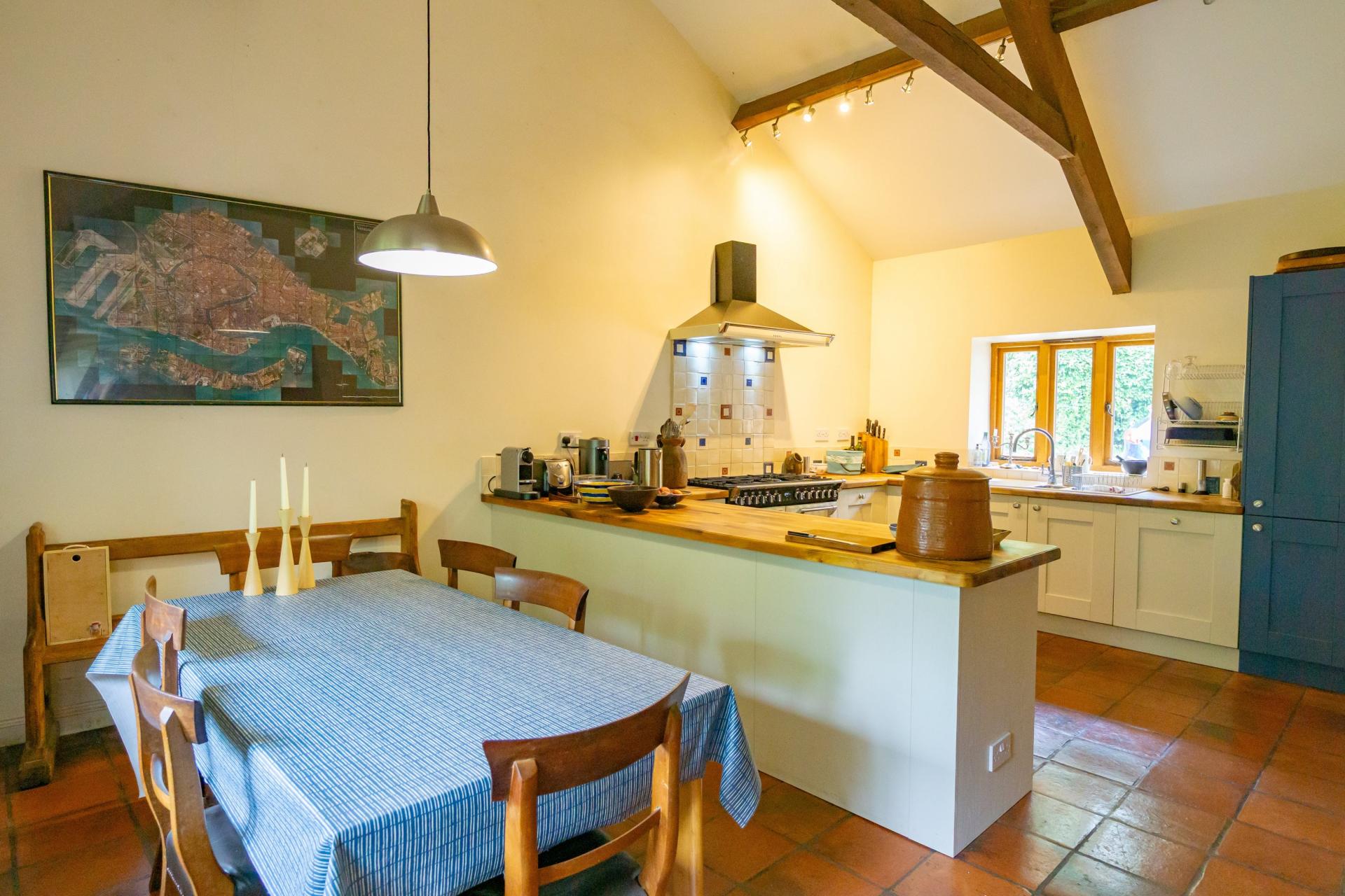 Perfect for family life and entertaining, this generous open plan area has windows on two sides providing lovely views into the garden and a vaulted ceiling with exposed beams and trusses.
