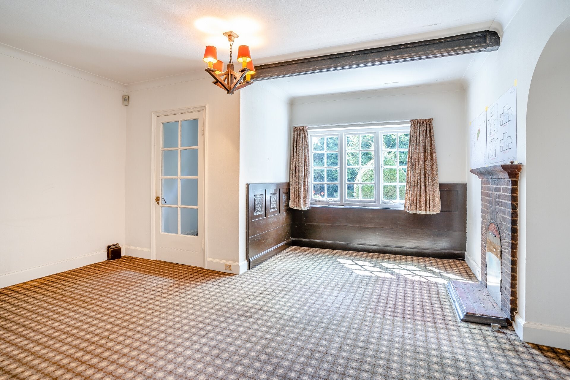 An arched doorway to the side of the fireplace leads to a dining room, which also features a brick fireplace. The room is flooded with natural light from a large bay window overlooking the front garden.