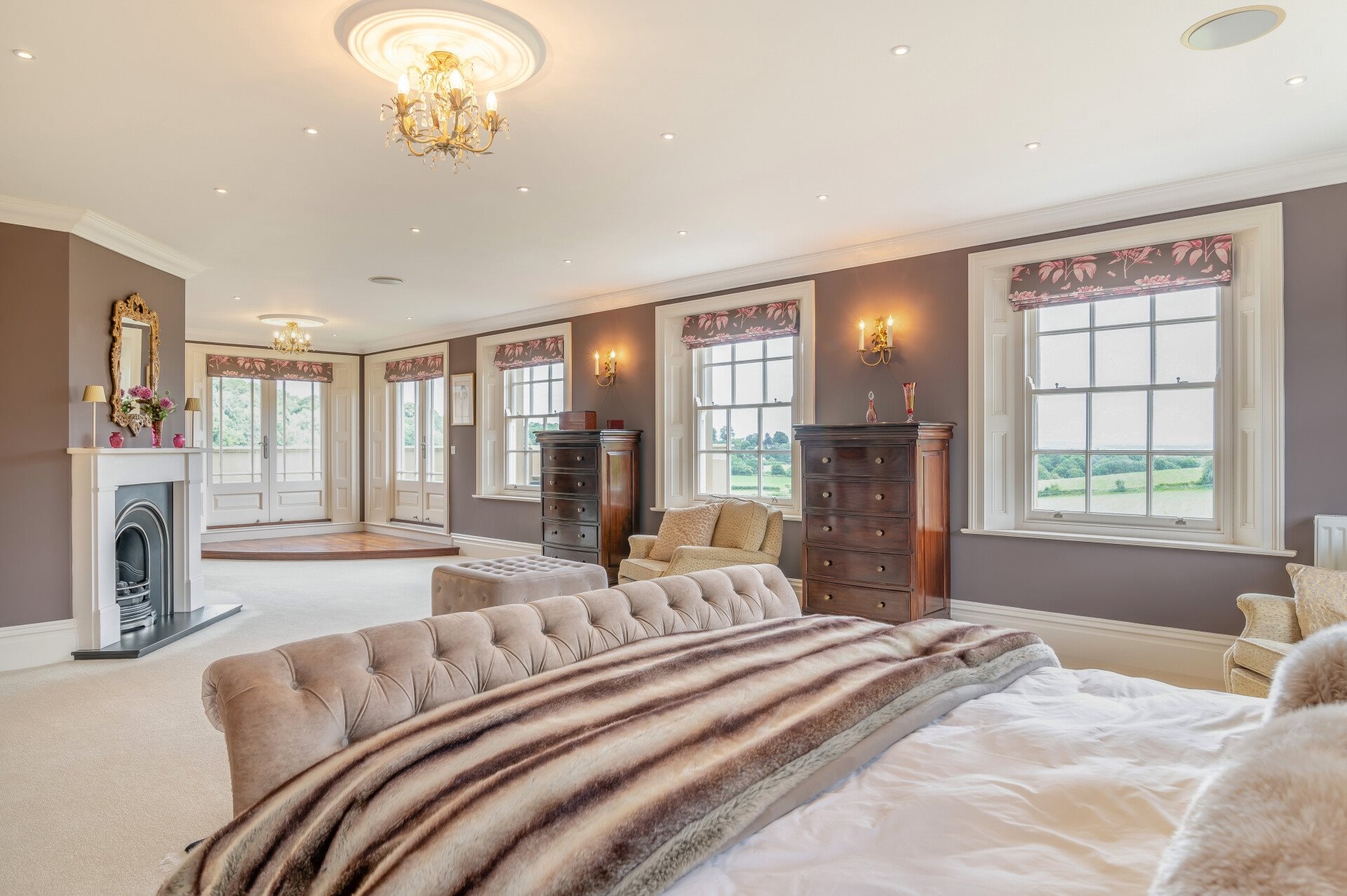 The principal bedroom suite is an exceptional private sanctuary, featuring a period Chesney fireplace, a Neville Johnson fitted dressing room, and a lavish en-suite with walk-in wet room nd freestanding claw-foot bath. A private balcony offers the perfect vantage point to take in the breathtaking rural views.