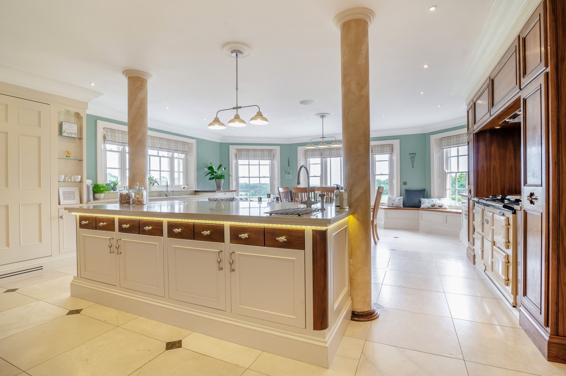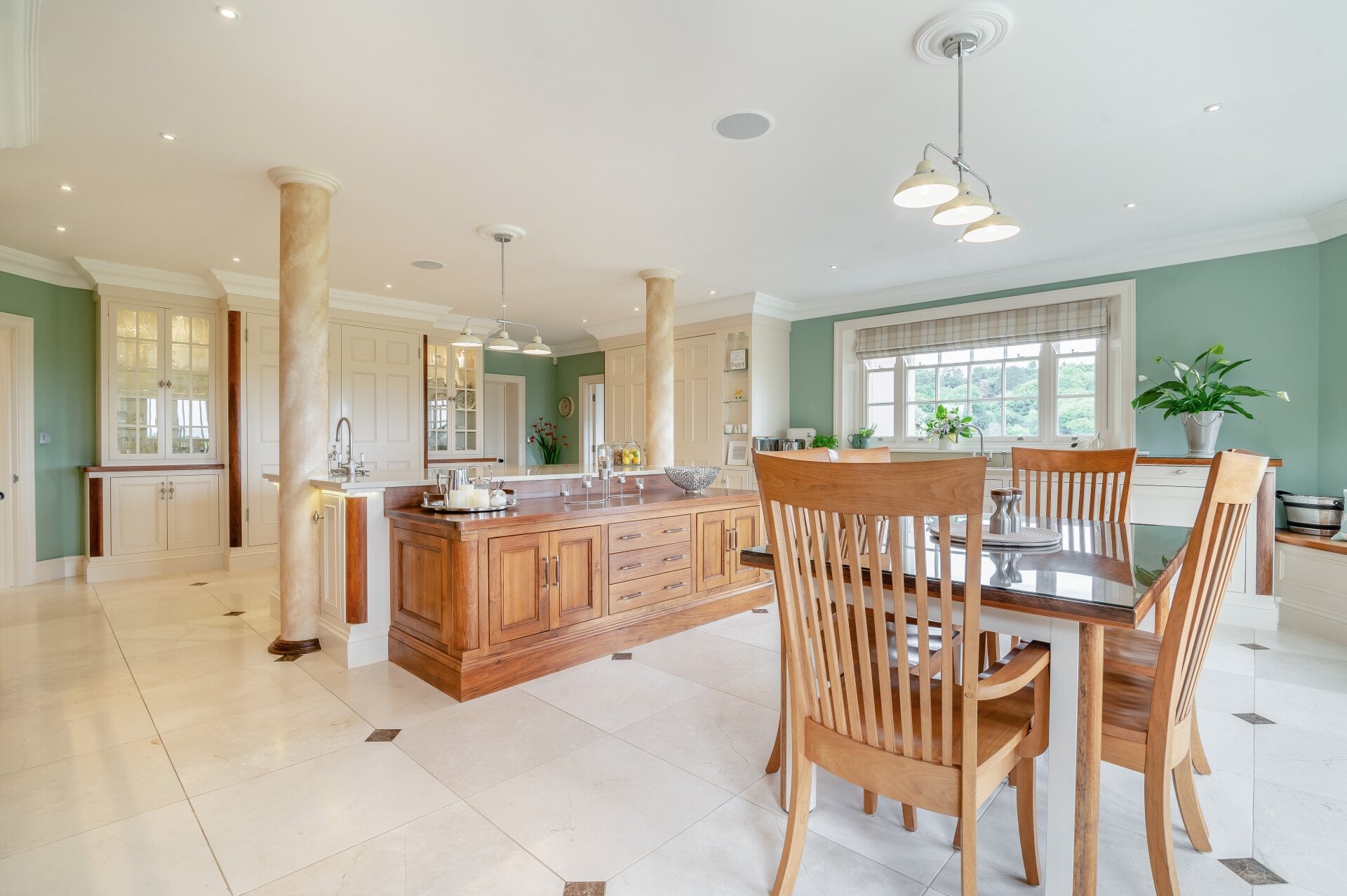 The formal lounge is a haven of tranquillity, with French doors opening directly onto the gardens, creating a natural flow between indoor and outdoor living. The elegant dining room, laid with oak parquet flooring and crowned with an orangery-style glass roof, offers a striking space for entertaining and connects effortlessly to the bespoke kitchen. A culinary masterpiece, the kitchen is fitted with a four-oven Aga, Gaggenau and Siemens appliances, granite worktops, and panoramic views.
