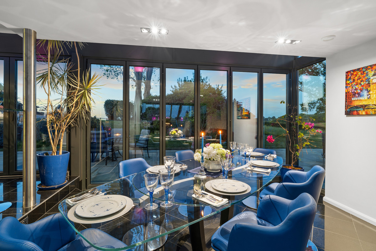 Set beneath a dramatic mini atrium, the dining area features six-section aluminium glass folding doors opening to the rear terrace with ambient lighting creating a perfect space for both intimate dinners and entertaining.